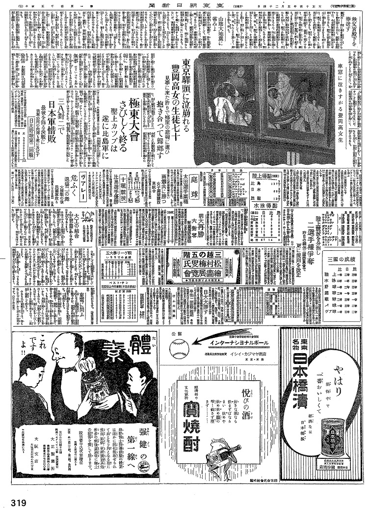 ※以下は地震関連の見出しと重要と思われる部分をテキスト化したものである ○山陰大地震に省みよ 山陰地方の大地震が、その震害区域の比較的少なかりしは、不幸中の幸いであったが、被害地方の町村に対しては、関東大震災の災害の跡未だ鮮やかなる、特に深甚なる同情の念に堪えないのである。しかして伝える所必ずしも明らかではないが、豊岡城崎等の被害が地震そのものよりも、これによって起こった火災によるもの甚だ大なりしが如きは、同一経験を有する東京横浜当の市民が、再び二年前を省みてははだはだに?を生ずる思いがあるのである。しかしながらこの事は東京横浜の市民のみならず、我が国民が均しく考えなければならぬ問題であるが、吾人はこの際今一度東京横浜市民が特に、是に注意を集め、改めて復興の事に努力せんことを切望するのである。帝都復興の事案が、一通りならざる困難なるべきは、初めより期せらえた所であるが、今日の状態を以ってしては、余りに進行の度合が遅々としていることを??させざるを得ぬのである。これには政略的立場からして、当初の計画を理由なく変更し、復興官庁を縮小し、その性質上というよりは、その現状よりして不適当なること明らかなる東京市に多くの責務と負担を負わせた政友会の責任をも回想せしむるのであるが、それにしても政府も政?も、政権の政争とに没頭して、かくの如き大事業に力を注ぐこと薄く、都民国民市民にこの大事業を理解せしめ、これに努力せしむる所無く、帝都の生活を未曽有の不安に?らしめているのである。思想悪化もこれより生じ、失業者の洪水もこれより生ずるのである。 東京市民は震災後既に幾度もの火災を経験したが、その不安なる生活を続けながらなお帝都復興の基礎である??整理の進行に力を貸すこと未だ必ずしも十分でない。吾人は関東地方に再び大地震が襲来すべしと予言するのではないが、山陰地方の大地震の報を聞いて、帝都復興の現状を見て、これを他事ならずと思い、市民と当局の猛省を促すのである。 ○東京駅頭に泣き崩れる豊岡高女の生徒七十 見学に来たばかりで郷里の悲報に遭い 抱き合って帰郷す 車窓に泣きすがる豊岡高女生 |