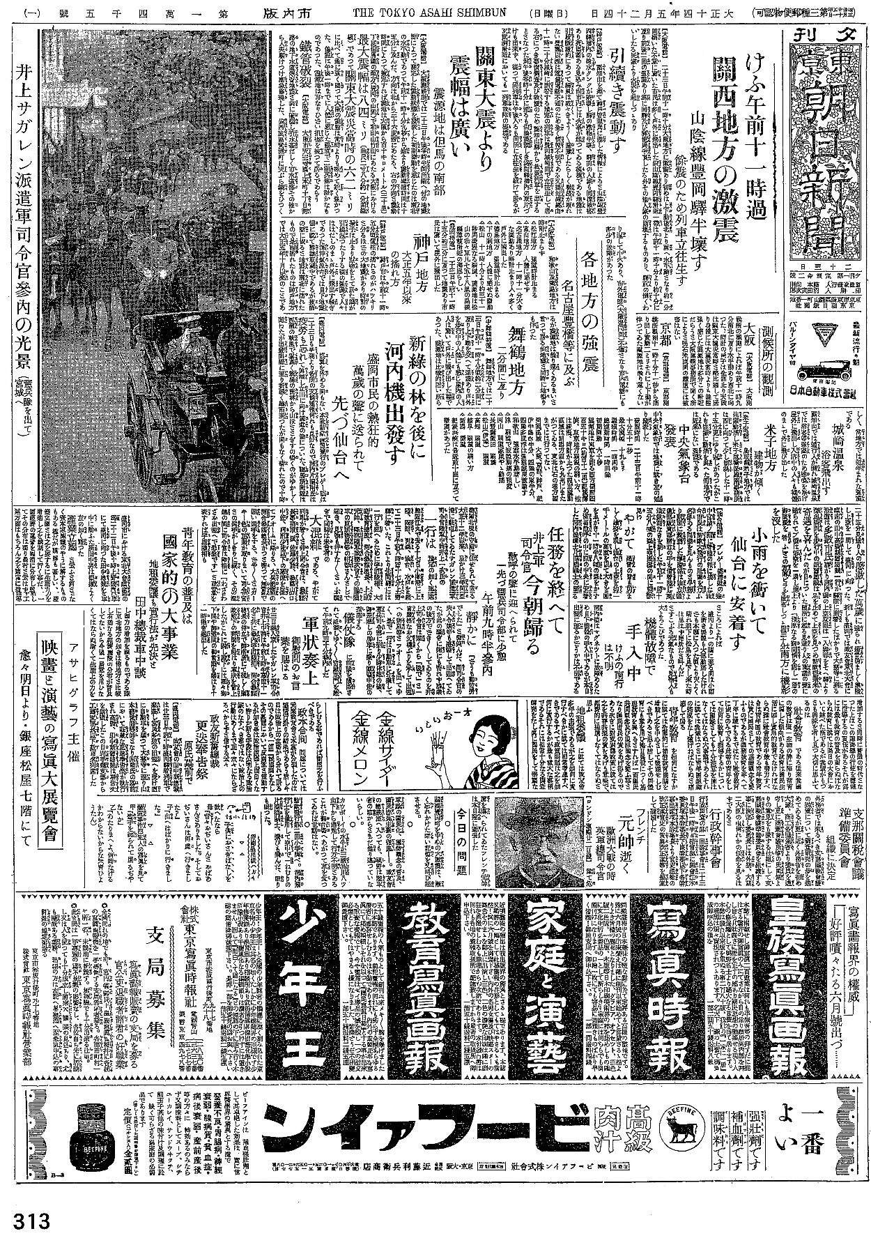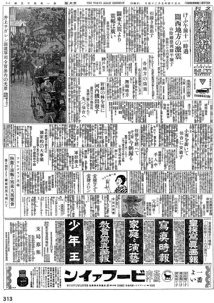 ※以下は地震関連の見出しと重要と思われる部分をテキスト化したものである ○今日午前十一時過 関西地方の激震 山陰線豊岡駅半壊す 余震のため列車立往生す 【大阪電話】二十三日午前十一時十分大阪地方に激震あり初めは上下動のち北より南へ水平動となり約一分間続いた不意に驚いた市民は多く戸外に飛び出したなお山陰本線豊岡駅付近一帯は午前十一時十分おり約十分にわたり前後二回の強震ありために同駅及び郵便局半壊したる外その他人家の崩壊するものあり、駅前の???民家より火災を起こしつつあり ○引続き震動す ○関東大震より振幅は広い 震源地は但馬の南部 【大阪電話】大阪測候所では二十三日午後零時半同所備え付けの地震計によって測定した振動状態を発表した初期微動を感じたのは南北の水平動であって午前十一時十分九秒から始まり震動継続時間は十五分に及んだ、方向は北から三十六度西にあたる、右の方向と震動時間によって検定すれば震地は大阪から百十キロメートル(三十里)丁度但馬?の南方(豊岡の山間)で和田山竹田にあたる大阪における最大振幅は八四ミリ(曲尺二寸八分約一分間継続)であって関東大震災当時の六二ミリに比べて遥に強く?つて大阪の震動は常時よりも極めて?く強かった、余震は午後一時までに人体に感じた程度二回?他はかすかなものであった、震源地はかなりひどい損害を被っているであろう ○各地方の強震 名古屋豊橋等に及ぶ 神戸地方 大正五年以来の揺れ方 舞鶴地方二分間にわたり 城崎温泉 浴客飛出す 米子地方建物が傾く ○中央気象台発表 中央気象台では地震につき左の通り発表した ??時間 二十三日午前十一時十分五十一秒 最大振幅 十九ミリ 継続時間 一時間半 総震動時間 一時間? 初期微動 六十秒 震源地は東京を?る西方?南四百五十キロ(約百十二里)???、東京地方??の弱い方、性は緩慢、時計が止まった??震動区域は新潟方面から九州にまたがっている、東北は石巻方面までは行っていない 強震地域 大阪、京都、神戸、伊豆半島西半分、四国の東半分、四国多度津は強震??激動す △和歌山 強震水平動激しい △津 弱審で液?動揺の?度 △岡山 弱震 家屋やや動揺 △長野県飯田 弱震 △松山(伊?) 弱審 △高知 弱震 △岐阜 弱震の弱い方 △新潟 微震 紀淡海峡は最近数十回にわたって微震があった |