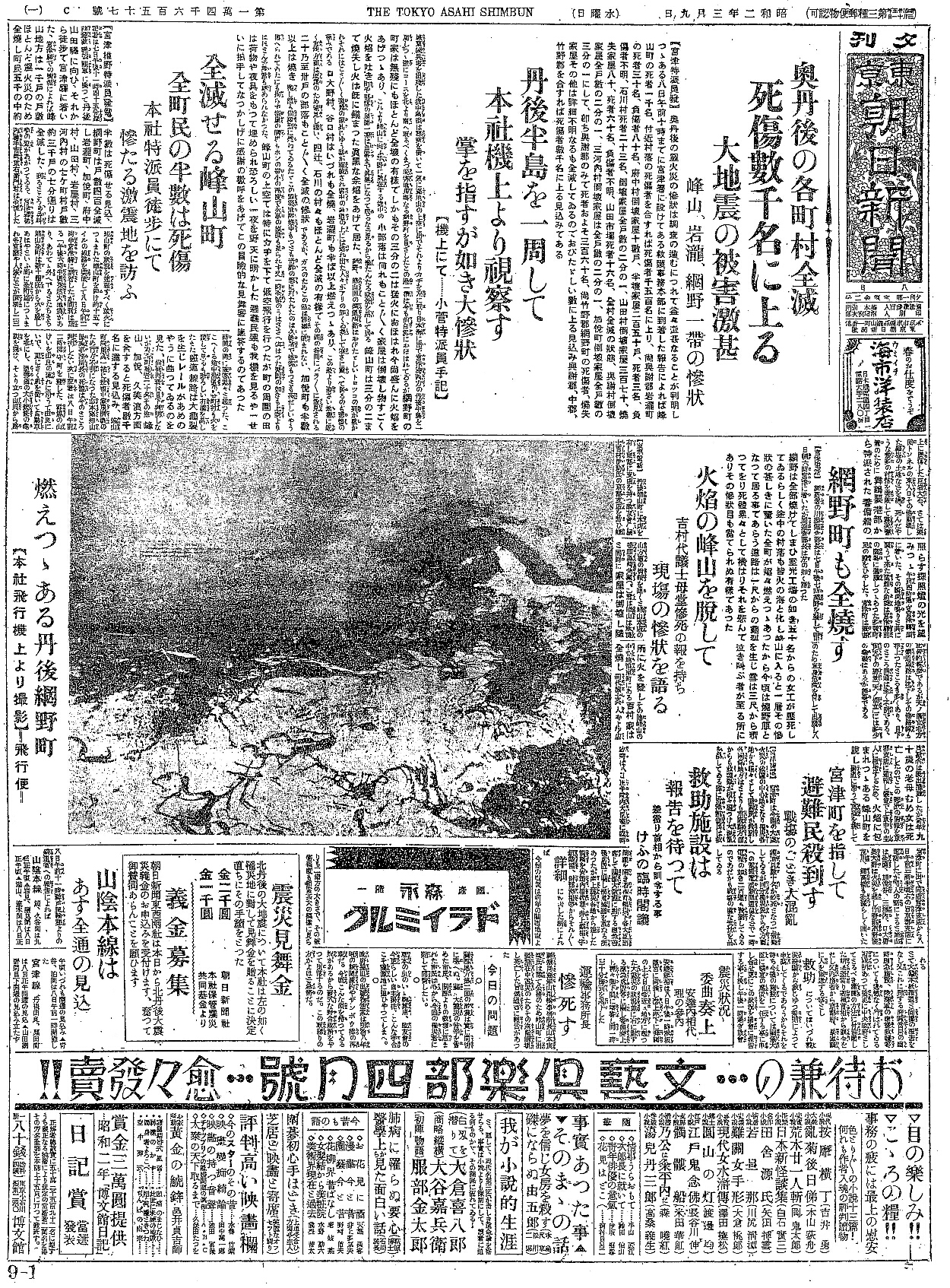 ※以下は地震関連の見出しと重要と思われる部分をテキスト化したものである ○奥丹後の各町村全滅 死傷数千名に上る 大地震の被害激甚 峰山、岩滝、網野一帯の惨状 ○丹後半島を一周して本社機上より視察す 掌を指すが如き大惨状 【機上にて・・・小菅特派員手記】 ○全滅せる峰山町 全町民の半数は死傷 本社特派員徒歩にて 惨たる激震地を訪ふ 【宮津椎野特派員発電】記者は七日午後十一時四十五分??列車に乗って丹後山田駅に向い、それから徒歩で宮津駅に着いた、宮津駅での情報によれば峯山地方は一千戸の戸数ほとんど震火災のため全焼し町民五千の中約半数は死傷せる見込、網野町は戸数四百全滅し岩瀧町、加悦町、府中村、山田村、岩屋村、三河内村の七ケ町村戸数約三千戸の七分通りは全滅した、至る所で阿鼻叫喚の声が上がっている、宮津駅??吉崎重右衛門君は全滅した峯山町の状況を??すべく猛火につつまれた峯山町を抜け約十五マイルの線路を突破して八日午前二時半宮津駅に到着したが同君は語る「午後六時半頃突然大地震があり、あわてて外にでるとたちまち峯山全町は数十カ所から火を発しあはやという間に??炎につつまれ各官庁や人家などが倒壊し二三時間の間に被害累々と起った、ここへくる途中沿道の各町村も火を発して見るも恐ろしい有様を呈したまた鉄道線路は大亀裂を生じレールがあめのように曲がっているのを見た、尚死傷者は目下判明しないが??町死者二十名その他、峯山、加悦、久美浜方面を合すると死傷者数千名に達する見込、峯山町??に投宿中家屋倒壊のため行方不明となった山本福知山保線事務所長の死体は今のところ判明しない次に記者は八日午前二時??河守町を?した、??の山けいを由良の流れに沿うて由良にいで、さらにさく風を衝いて自動車を北にし、道路面の大小幾条の亀裂を避け、そそりたつ山頂から路上に墜落した巨岩大石、されは栗田トンネルの東入口その他築堤の土地などを?、死んだような幾多の村落を突破して震災警備のために舞鶴要港部から特派された警備艦の照らす探照灯の光を望みつつ午前四時過ぎ宮津駅頭に着いた、その瞬間地鳴りと共に襲うて来た猛烈な余震は宮津駅前の広場に避難しつつあった??町民の肝をひやした、宮津町は被害比較的軽微であるが天の橋立北方の鉄道線路は沈下しその他路線も浮き上がったところも多くあり、目下のところ開通は全く不明である、尚天下の勝景「天ノ橋立」には多少の亀裂はあるが無事である ○網野町も全焼す ○火炎の峰山を脱して 吉村代議士母堂惨死の報を待ち 現場の惨状を語る ○燃えつつある丹後網の町【本社飛行機上より撮影】ー飛行便ー ○宮津町を指して避難民殺到す 戦場のごとき大混乱 ○救助施設は報告を待って 差当り首相から訓令する事 きょうの臨時閣議 ○運輸事務所長 惨死す ○山陰本線はあす全通の見込 |