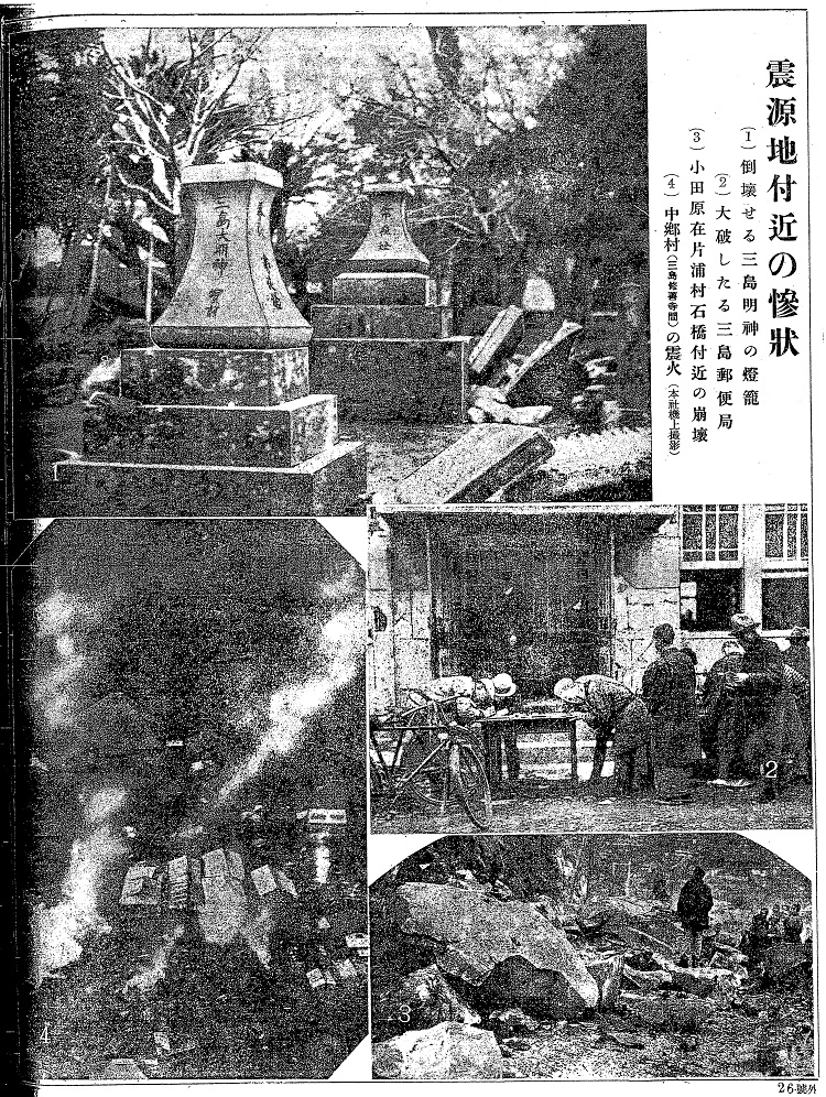 [1930_11_26_01]震源地付近の惨状 (1)倒壊せる三島明神の灯篭(東京朝日新聞 号外1930年11月26日)