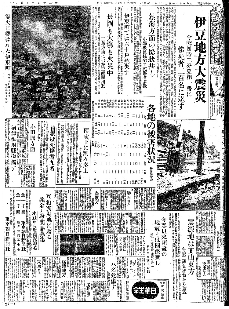 ※以下は地震関連の見出しと重要と思われる部分をテキスト化したものである ○伊豆地方大震災 今暁四時三分豆相(ずそう)一帯に 惨死者二百名に達す 二十六日午前四時三分、突如として北伊豆地方を中心に東海、関東一帯にわたる大激震あり去る大正一二年の関東大震災に次ぐ大惨害を引起した、地震と共に帝都と伊東、熱海、箱根、三島、修善寺、長岡、下田及び八丈島方面の電信電話は一時全く不通となり、東海道本線は御殿場、裾野間の土砂崩壊のため一時間半不通となり、さらに熱海線根府川熱海間はようやく午後二時に至って開通を見たが、震害地より本社に達した刻々の情報は意想外の惨状を伝え午後二時までに判明せる惨死者は実に二百名を超え、全壊家屋三百戸、半壊数千戸に上り、しかして死傷者及び半壊の家屋は更に更に多数に上る見込みであるが、伊東、三島、韮山、長岡等では地震と共に火を発し焼失家屋約三百五十戸、豆相の著名の温泉地はあるいは全滅し又は惨禍のちまたと化した ○熱海方面の惨状甚し 小学教員住宅で死傷者多数 ○伊東町では六十戸焼失す ○長岡も大場も火災中 三島方面には第三師団出動 ○各地の被害状況 警保局発表 ○両陛下に刻々奏上 畏くも御心痛あらせらる ○箱根は死傷者九名 ○小田原方面 ○沼津御用邸損傷す ○静岡地方 浜松地方 ○皇族方御別条なし ○沼津地方 政府応急策協議 被害の結果見た上で減免税行われん ○第二予備金支出せん 大蔵省の意向 ○震源地は韮山東方 午後二時気象台から発表 ○今春以来頻発の地震とは関係無し 通常の大地震の性質を帯ぶ 今村明恒博士の談 「今朝の強震は帝大地震学教室観測計では発震時午前四時三分八秒となっており十三秒の後主要動となり周期一・七秒につき二・一センチメートルの振幅を示したこの故に震度は重力の加速度の二部九厘に当たるただし?震後三・七秒の後一層大きい地震が加わってきた模様がみえる、従って地震の大きさも主要動力の到着後次第に大きくなりおよそ三十秒の後においては十四・六センチメートルの大きさに達した、しかし震動の周期は一〇・五秒というほどの緩慢な震動であったkら人体には単に船の動揺を感ずる程度に過ぎなかった震動の人体に感じた時間は五分間程であったが十倍の地震計には二時間半も??記録しているまた初動の方向は北五十三度東の上方動であるから震源の方へは右と反対な向きをとりそれは観測地からおよそ百キロメートルの地点に当たり丁度伊豆、駿河湾堺に相当する、昨日この地震学教室の那須、?上?理学士が地震計を三台もって伊東方面に向け現場観測に出かけた、その意味は伊豆の地震の震源地を正確に測定する積りであった、なお本年三月から伊東で観測中の結果とこれ??理学士との観測の結果を綜合して見るなら一時??な震源地の位置が定まるであろう、これを?するに今回の地震は本春以来伊東付近において発生しつつあった局部性のものと異なり通常の大地震の性質を有しているなお将来の事に関してはこの教室にあるだけの機械では判断がつかないから、も少し現場の様子を調査した上でなければはっきりしたことはいえない」 ○関東関西にわたる地震 丹那トンネル亀裂を生ず [鉄道省午前十一時半発表]丹那トンネルの西口(大竹口)は各所に亀裂を生じ濁水多量に流出す、トンネル内にも崩壊数カ所あり工事不能であるトンネル内に作業中の人夫五名は生死不明で救護の手配中、東口(熱海口)は異状なし ○八名死傷す 熱海線真鶴駅の惨事 |