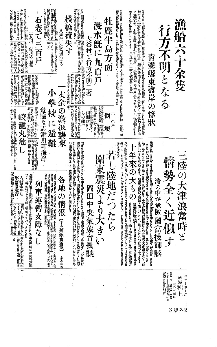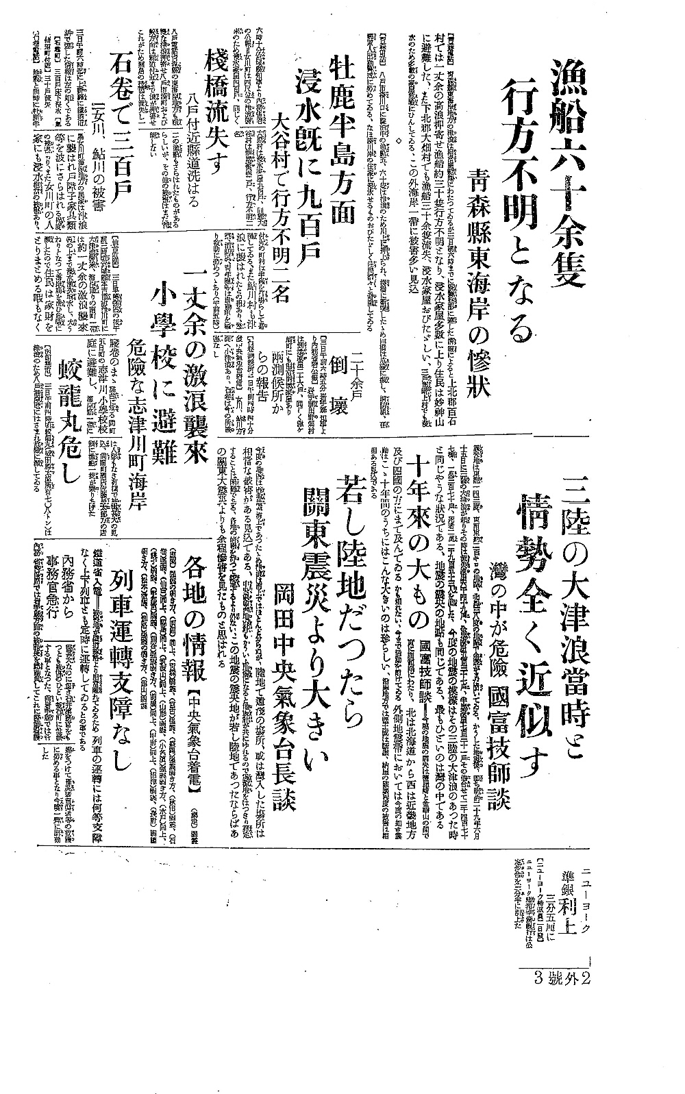 ※以下は地震関連の見出しと重要と思われる部分をテキスト化したものである ○漁船六十余隻 行方不明となる 青森県東海岸の惨状 ○牡鹿半島方面 浸水既に九百戸 大谷村で行方不明二名 ○桟橋流出す 八戸付近県道洗わる ○石巻で三百戸 女川、鮎川の被害 ○二十余戸倒壊 ○一丈余の激浪襲来 小学校に避難 危険な志津川海岸 ○蛟龍丸危し ○三陸の大津浪当時と情勢全く近似す 湾の中が危険 国富技師談 十年来の大もの 震央地は東経一四三度、東南東約二百キロの地点、北緯三八度の地点で余震がまだ続いている、こうした地震後、即ち明治二十九年六月十五日に三陸の大津波が起りその時は流失家屋六千四十九戸、全壊家屋五百二十七戸、半壊家屋七百三十一戸その外合せて二千四百七十七棟、一万二百七十戸、死者二万一千九百五十三人を出した、今度の地震の模様はその三陸の大津浪のあった時と同じような状況である、地震の震央の地点も同じである、最もひどいのは湾の中である 十年来の大もの 国富技師談=今暁の地震の震央は塩屋崎と金華山の間で実に広範囲にわたり、北は北海道から西は近畿地方及び四国の方にまで及んでいるかも知れない、今まで活動を?けている 外側地震帯においては今度の如き震動はここ十年間のうちにはこんな大きいのは珍らしい、沿岸地方では???は??、納屋の破壊程度の被害は??ある見込である ○若し陸地だったら関東震災より大きい 岡田中央気象台長談 今度の地震は震源地が海上であったため津浪は海上ではほとんど分からぬが、陸地で遠浅の場所、或いは湾入した場所は相当な被害がある見込である、中央気象台地震計もこういう地震になると地震計が共にゆれるので震源地をはっきり算定することは困難である、各地の情報をよって認定するより外ない、この地震の震央地が若し陸地であったならばあの関東大震災よりも余程惨害を見たものと思われる 各地の情報【中央気象台着電】 列車運転支障なし |