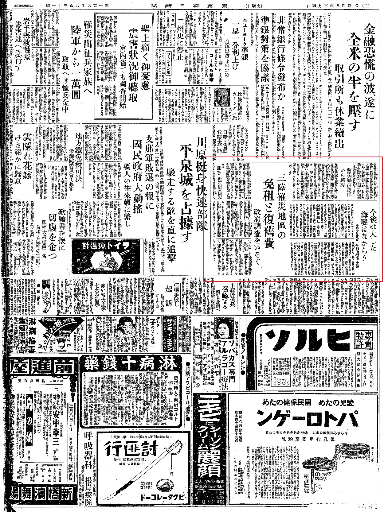 ※以下は地震関連の見出しと重要と思われる部分をテキスト化したものである ○三陸罹災地区の免租と復旧費 政府調査をいそぐ ○今後は大した海嘯はなかろう 帝大地震学教授 今村明恒博士談 最大振幅が十二センチメートルで先年の伊豆地震にひし六センチだけ少ないが、震源地との距離の関係だから距離を勘定にいれると??伯仲といってよい、しかし地形変化は伊豆の時は丹那断層が生じただけであったが今度は海底だから地震は伊豆の場合より数倍大きかろう、元来海底は地盤の性質上?く変動を起し易く従って海嘯も起こり易い、今回の海嘯は三陸方面で高さ十尺程度とのことだが明治二十九年六月十五日の三陸大海嘯の時は岩手県吉浜で八十尺、同県綾里で七十五尺だった、今度のは翌二十年八月五日のそれと位置も??似ている、当時宮城県石巻で十二尺同県女川で十尺、吉浜八尺、綾里九尺だった、外側地震帯(環太平洋地震帯の一部)の地塊運動だが??三陸海岸はのこぎりの歯のようになっており震源の方に口を向けているから海嘯の常習地の観がある、海嘯は沖では?りないのだが口の狭く浅くなる陸地に侵入すると高さが数倍、数十倍になるものだがその外側地震帯の三陸方面の活動は明治二十四、五年頃で納まっていた、唯北海道根室沖の大地震(明治二十七年)以来最近同方面に強震相次いでおきていたが金華山沖方面は静かだったので一時に大きな地塊運動がおこったもので今後被害を起す程度の海嘯はなかろう |