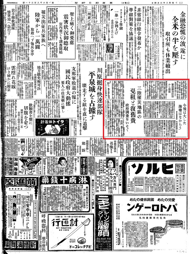 | [1933_03_04_01]今後は大した海嘯はなかろう 帝大地震学教授 今村明恒博士談(東京朝日新聞1933年3月4日) |
