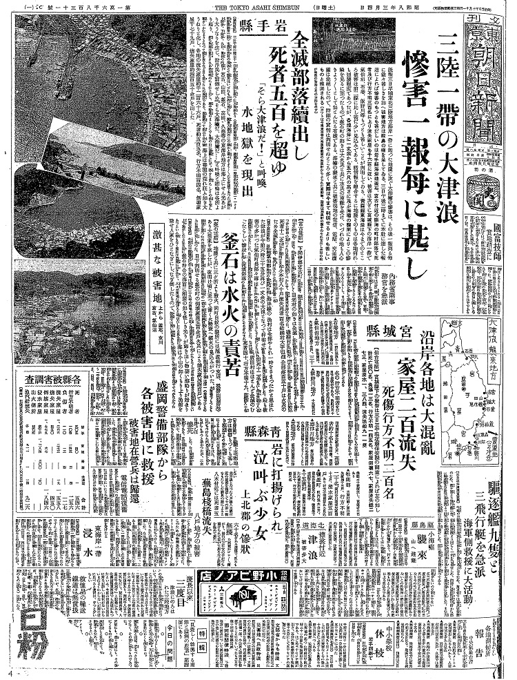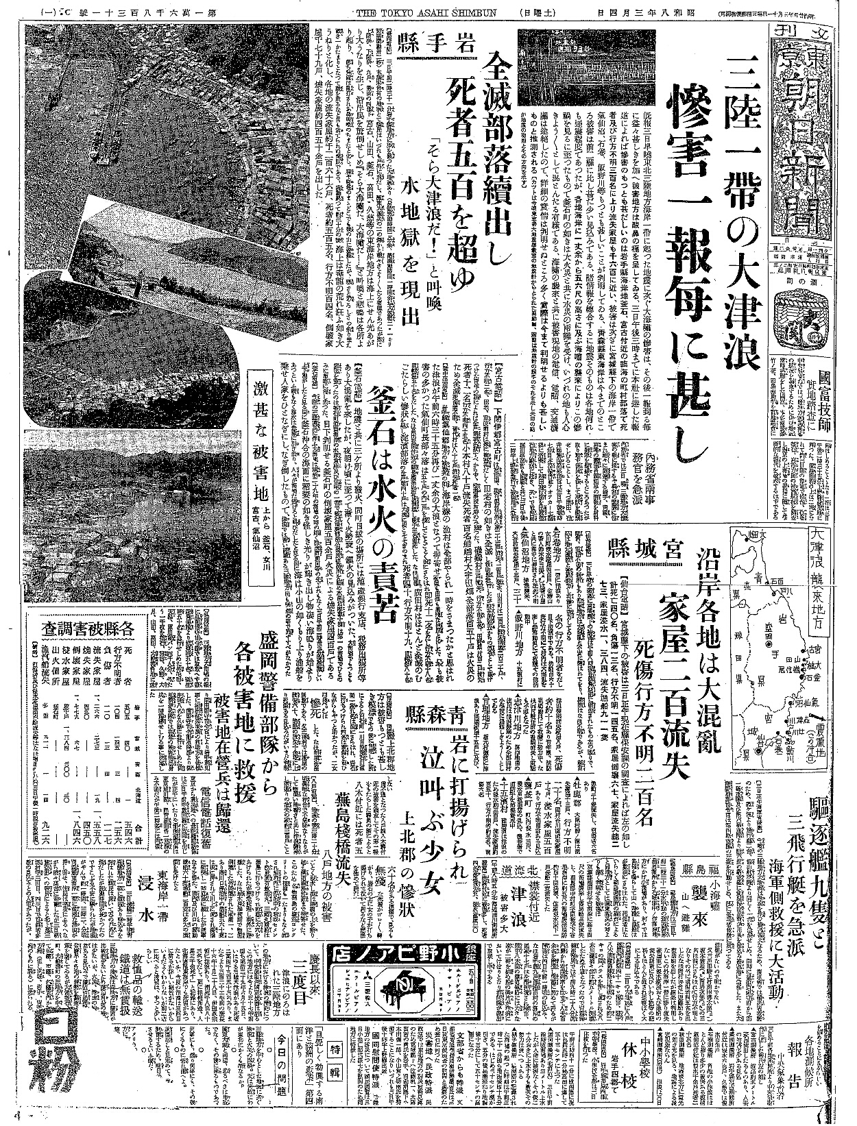 ※以下は地震関連の見出しと重要と思われる部分をテキスト化したものである ○三陸一帯の大津浪 惨害一方毎に甚し 既報三日早暁兼北三陸地方海岸一帯に起った地震に次次大海嘯の惨害は、その後一報到る毎に益々甚しきを加へ被害地方は酸鼻の極を呈している、三日午後三時までに本社に達した報道によれば惨害のもつとも甚だしいのは岩手県海岸地釜石、宮古付近の臨海の町村部落で死者及び行方不明三百名に上り流失家屋も千六百に近い、被害は次次に宮城県下の海岸一帯で気仙沼、石巻、飯野川等もっとも甚しいことが判例している、青森県東海岸は今までのところ被害は前二県に比し甚だ少い見込みである、諸情報を総合するに地震そのものは各地何れも強震程度あつたが、各地海岸に一丈余から五六尺の高さに及ぶ海嘯の襲来によりこの惨禍を見るに至ったもので釜石町の如きは大火災と共に水災の両難を受け、いづれの地も人心きようきょうとして混とんたる有様である、海嘯の襲来と共に被害現地の電信、電話、交通機関は杜絶したので、詳細の実情は判明せぬところ多く実際は今まで判明せるよりも甚しいものと推測される〔カットは今晩東京帝大地震学教室の地震計からとられた震動図、周期は地震計の?のそれを示し矢印の?が地震の初期とその方向を示す〕 ○岩手県 全滅部落続出し 死者五百を超ゆ 「そら大津浪だ!」と叫喚 水地獄を現出 ○釜石は水火の責苦 ○宮城県 沿岸各地は大混乱 家屋二百流失 死傷行方不明二百名 ○青森県 岩に打ち揚げられ 泣叫ぶ少女 上北郡の惨状 ○蕪島桟橋流失 八戸地方の被害 ○東海岸一帯浸水 ○福島県 小海嘯襲来 山へ避難 ○北海道 襟裳付近 津浪 被害甚大 ○慶長以来三度目 津浪にのろわれた三陸地方 ○救援品の輸送鉄道は無賃扱 ○駆逐艦九隻と三飛行隊を急派 海軍側救援に大活動 ○各地測候所 報告 中央気象台着 |