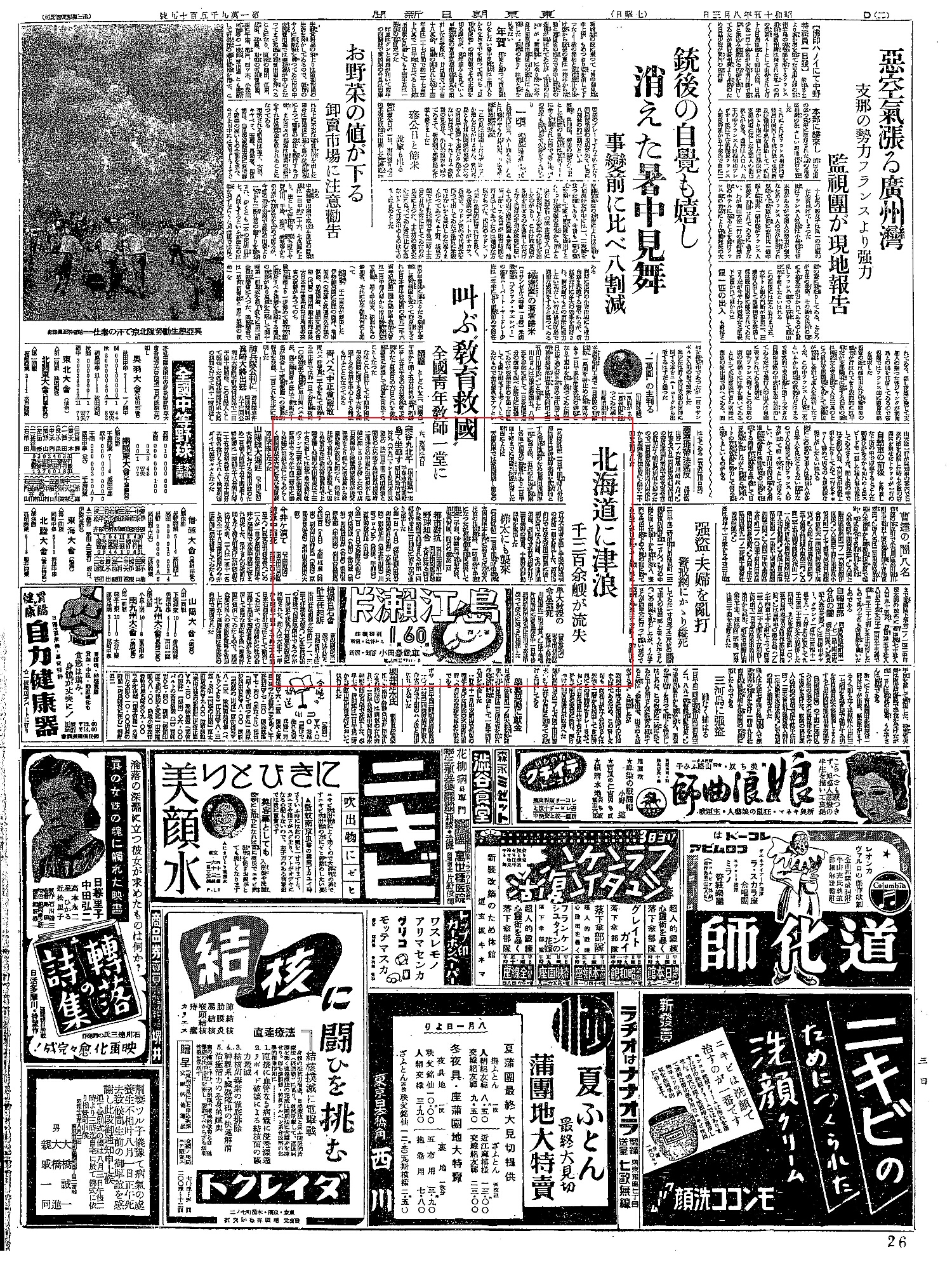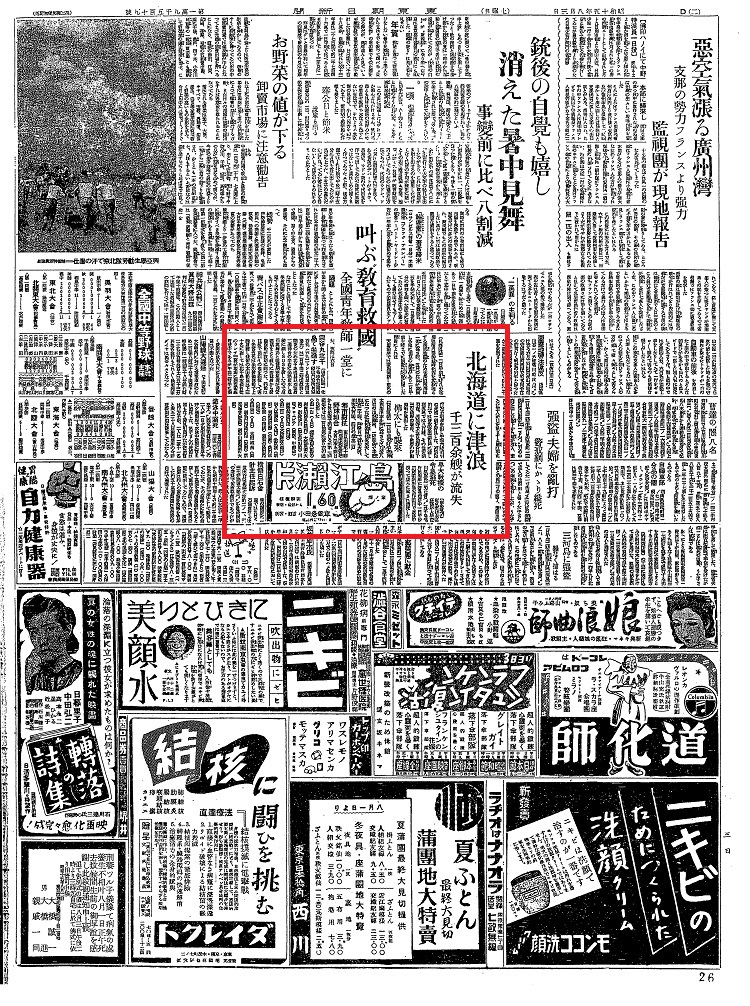| [1940_08_03_01]北海道に津浪 千三百余船が流失 樺太にも襲来(東京朝日新聞1940年8月3日) |