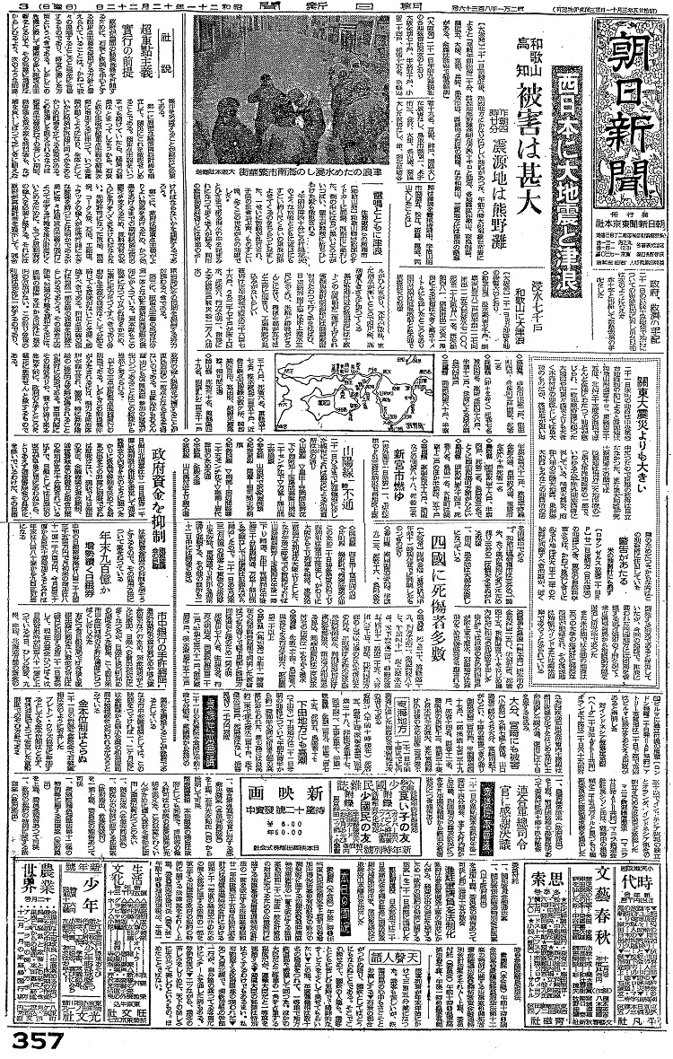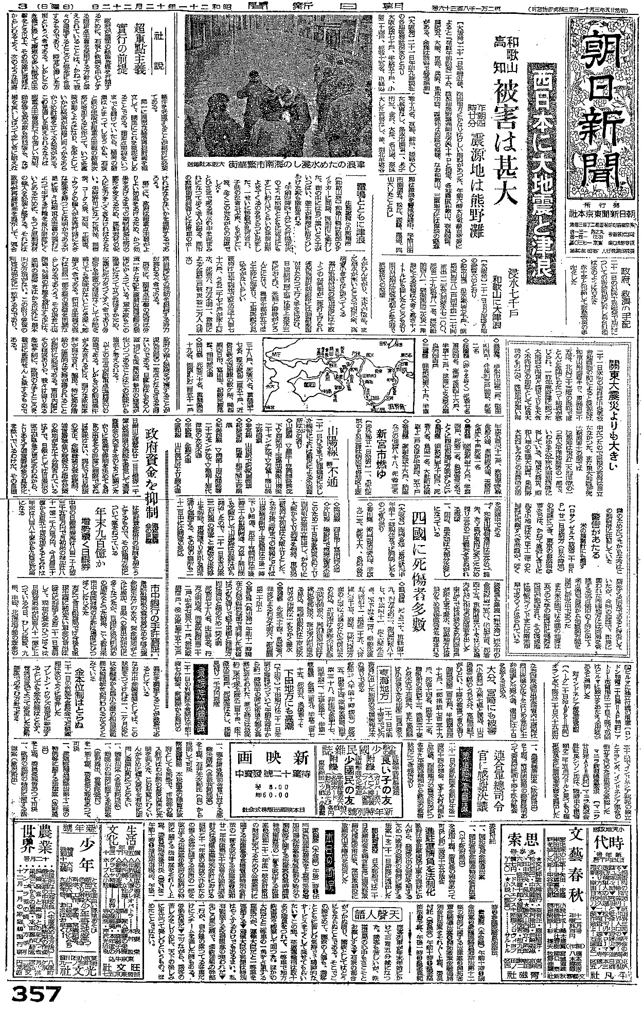 ※以下は地震関連の見出しと重要と思われる部分をテキスト化したものである ○西日本に大地震と津浪 和歌山 高知 被害は甚大 昨朝四時二十分 震源地は熊野灘 【大阪発】二十一日早???、四国地方にかなりはげしい地震があった、午前六時大阪気象台発表によると「??午前四時二十分、震源地熊野灘潮岬東方四十キロと推定、各地震度和歌山、奈良??、震度五、大阪、京都、兵庫、鳥取中震、震源地は烈震の模様、なお和歌山、三重地方には津浪の懸念がある、余震は微弱で経過??」 【大阪発】二十一日午前九時現在の各地被害状況次のとおり 大阪全壊七十戸、半壊五十戸、小破二十四戸、死者十五名、重軽傷者十九名、京都、神戸、姫路大した被害なし、鳥取市倒壊一、米子市三、金沢、大津、名古屋、奈良大した被害なし、津、南北牟婁各具は津浪を警戒待?中、宇治山田市倒壊五、松江、広島、尾道、岡山大したことなし ○雷鳴と共に津浪 生地獄さながらの海南市 【和歌山発】和歌山県???のサイドカーに同乗、海南市に?行した、街の中には?つ黒いどろ土がいっぱい、壁土が無残に落ちひしゃけた家も散見される”午前四時四十分ごろ打上花火のような雷鳴とともに夜目にもすごい約八尺くらいの津浪が押しよせてくるのをちらっとみました、一せいに?鐘が乱打され、子供の泣き叫ぶ声、ものすごい波、全くこの世ながらの地獄でした”とひざまでくる海水の中を泥まみれになって歩く老人が語る、同市の繁華街東浜通りには電車のポールがひんまがり、木片が散乱、まだ潮水が深いところで四尺余、高潮が小きざみに襲ってくる。 黒江?港付近の???十数トンの帆船が二隻打上げられ省線海南駅?道路には倒壊家屋が横たわって行く手をはばむ、日東紡海南工場は床上浸水三尺におよび、米綿と織機がどろんこになり、機械?部が五寸ほど土砂に埋まり、工場再起の見込がないらしい 被害は正午現在で浸水三千六百七十六戸、うち二千七十戸が床上浸水、死者六、行方不明一、津浪による全壊三戸被災者二万人(??) ○浸水七千戸 和歌山に大津浪 ○関東大震災よりも大きい 二十一未明の地震は中央気象台地震課の?によると震源地は和歌山南四百キロ、東経百三十五度、北緯三十三度の海底でほとんど全国にわたって地震が感じられ、一昨年熊野灘に起った大地震や関東大震災よりも大きく本邦付近の地震としては最大級のものだが、震源地が遠い海中だったので?接の被害は目立たなかった、また東大地震研究所萩原博士の話では震源地は世界二大地震帯の一つ環太平洋地震帯の一部で、いわゆる太平洋外側地震帯に属している、関東大震災、昭和八年の三陸大地震、東南海大地震もみなこの地震帯の活動のためだったから学者はこの地震帯に注目していた。 ○警告があたる 米の地震計にも感ず 【ロサンゼルス放送二十日RP】廿一日夜明方(日本時間)の地震につき、東京の自然科学者たちは、かねて最近しきりに起る小地震は大正十二年の大地震に匹敵すべき激震が、近く襲来する前兆であると警告していたが、今回の地震で、津浪に襲われた四国地方には??を?理する英占領軍の了解を得て、米占領軍当局から地震調査団を派遣し研究中であった。 米本国では今回の地震は五つの大学の地震計に強烈な震動が記録され、その震源地は?領東インドまたは南米西岸であろうと見られている ○新宮市燃ゆ ○四国に死傷者多数 ○大分、宮崎にも被害 ○山陽線一時不通 ○下田地方にも高潮 |