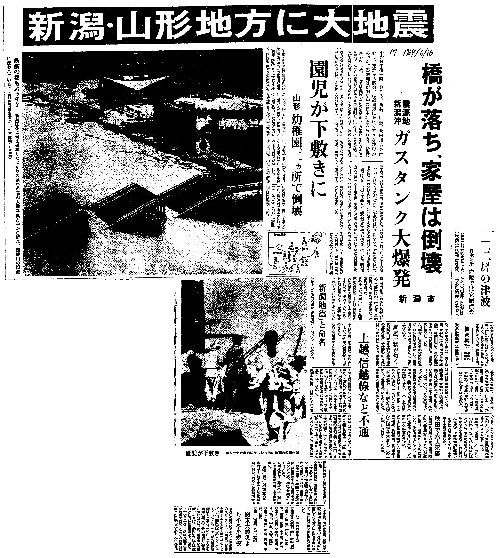 | [1964_06_16_03]新潟・山形地方に大地震 橋が落ち、家屋は倒壊 震源地 新潟沖 ガスタンク大爆発 新潟市 園児が下敷きに 山形 幼稚園、二カ所で倒壊 1,2メートルの津波 日本海岸 佐渡では家屋流出 「新潟地震」と命名 家屋三割が傾く 上越、信越線など不通(毎日新聞1964年6月16日) |