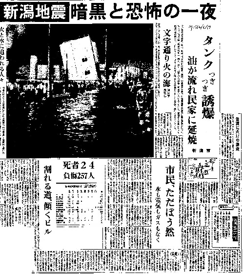 | [1964_06_17_03]新潟地震 暗黒と恐怖の一夜 タンクつぎつぎ誘爆 油が流れ民家に延焼 新潟市 文字通り火の海 消火手段なし 市民、ただぼう然 水も電気もガスもなく 死者24負傷257人 割れる道、傾くビル(毎日新聞1964年6月17日) |