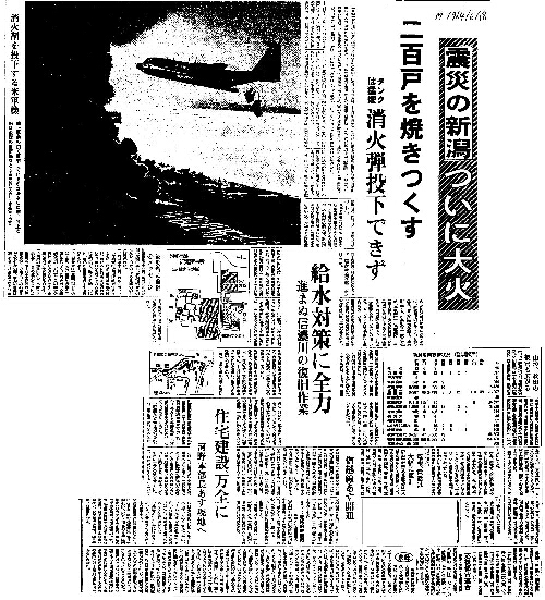 | [1964_06_18_01]震災の新潟 ついに大火 200戸を焼きつくす タンクは猛煙 消火弾投下できず 給水対策に全力 進まぬ信濃川の復旧作業 信越線あす開通 住宅建設、万全に 河野本部長あす現地へ 山形、秋田の被害も広がる(毎日新聞1964年6月18日) |