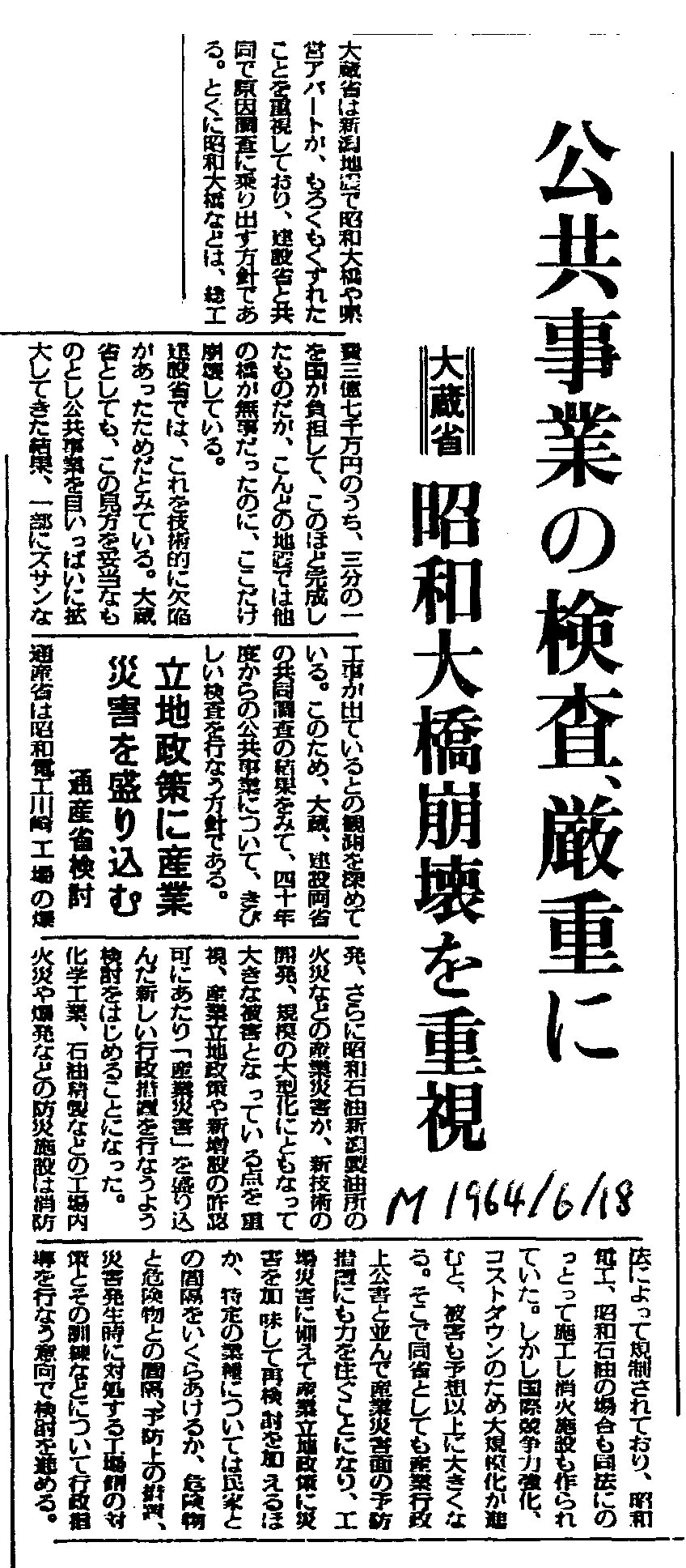 | [1964_06_18_02]公共事業の検査、厳重に 大蔵省 昭和大橋崩壊を重視 立地政策に産業災害を盛り込む 通産省検討(毎日新聞1964年6月18日) |