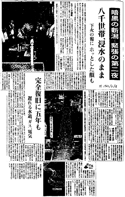 | [1964_06_18_05]暗黒の新潟 緊張の第2夜 8000世帯、浸水のまま 下火のほうに ホッとした顔も 完全復旧に5年も 遅れる水道、ガス、電気 5万人が避難 一部に電気も 土のうを早く 感謝される若い力 自衛隊 1万6000人が待機 谷川岳登山に警告 地震で沢の様子変わる(毎日新聞1964年6月18日) |