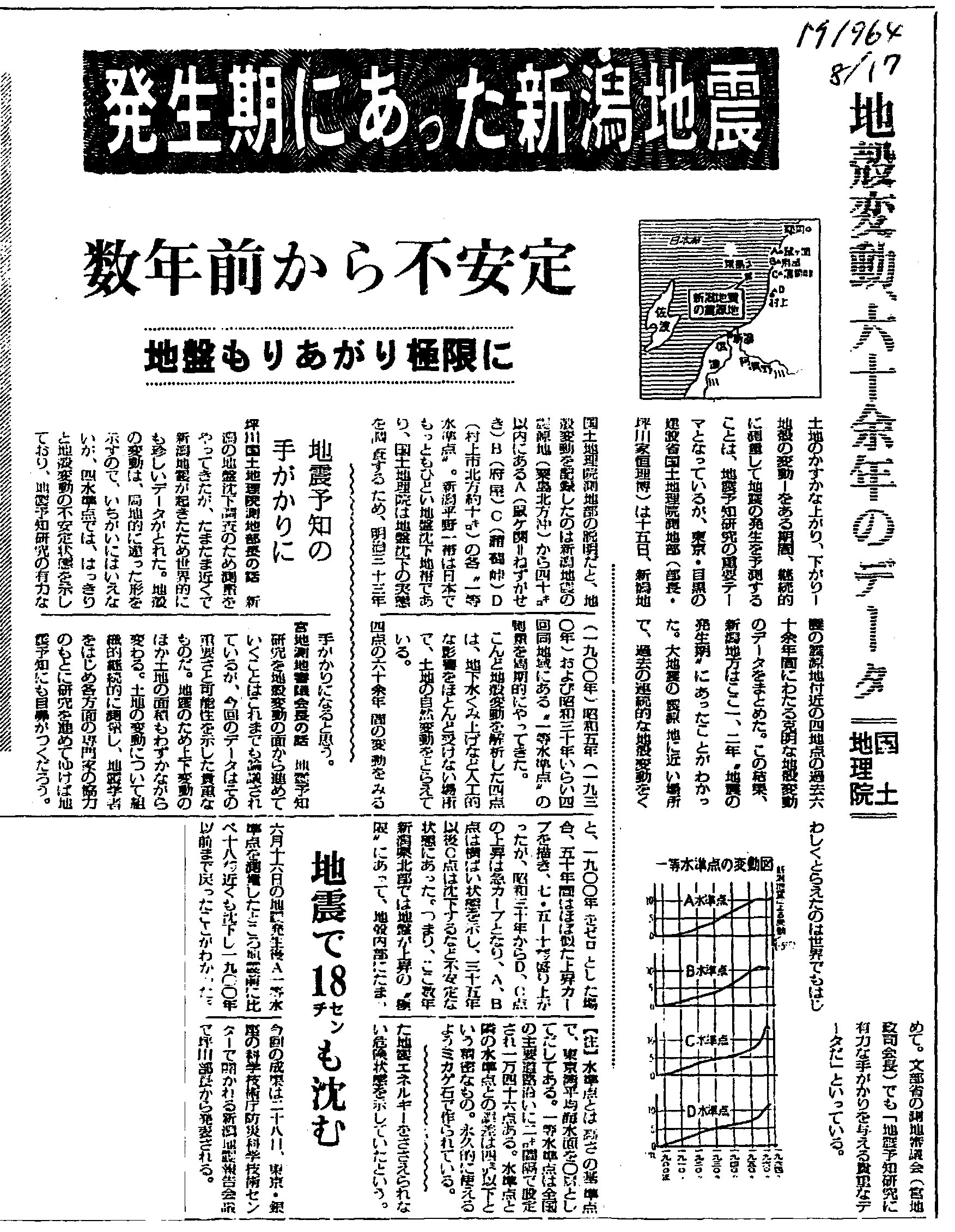 | [1964_08_17_01]発生期にあった新潟地震 地殻変動、60余年のデータ 国土地理院 数年前から不安定 地盤もりあがり極限に 地震予知の手掛かりに 坪川国土地理院測地部長の話 宮地測地審議会長の話 地震で18センチも沈む(毎日新聞1964年8月17日) |