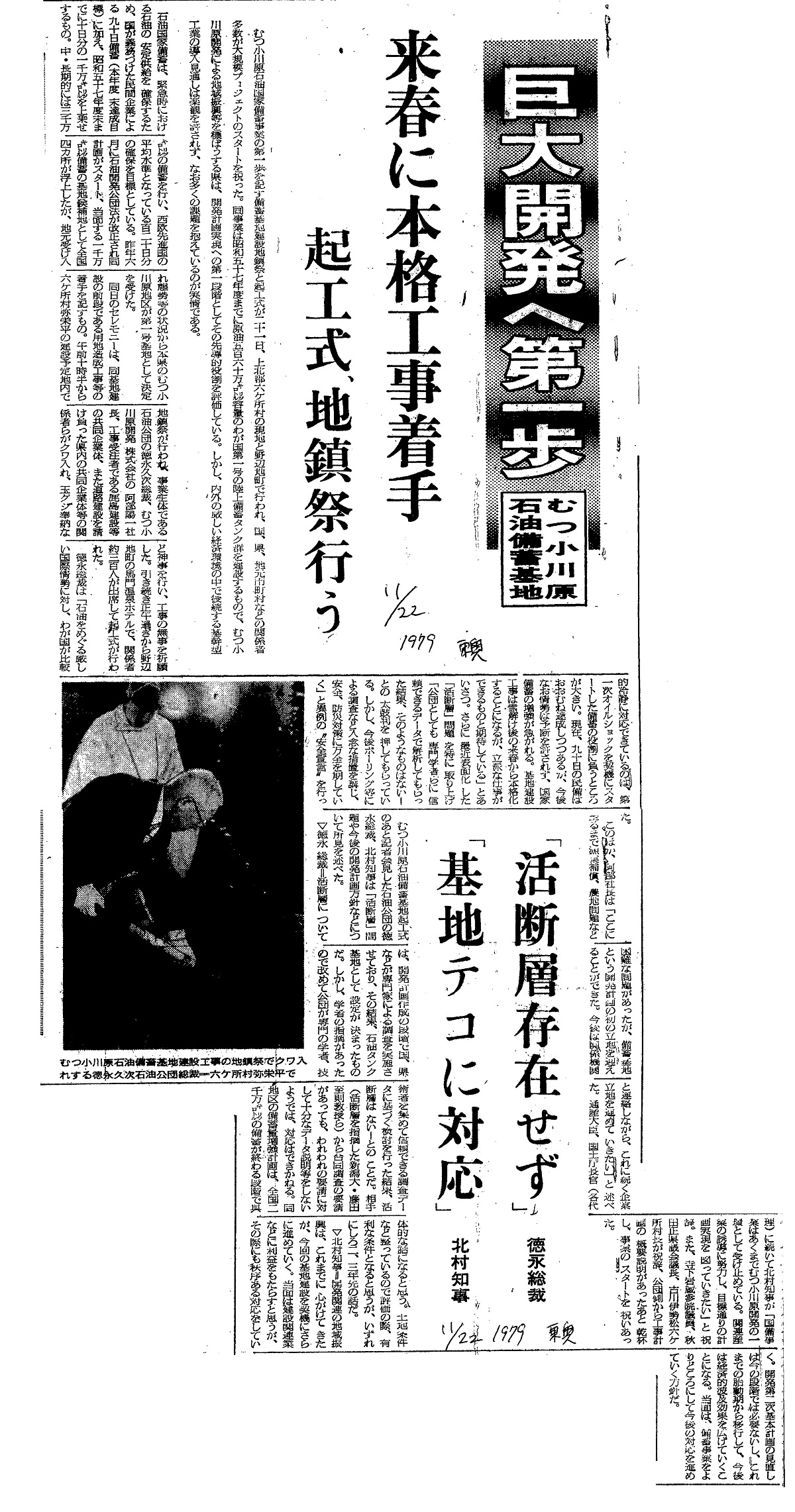 | [1979_11_22_01]巨大開発へ第一歩 むつ小川原石油備蓄基地 来春に本格工事着手 起工式、地鎮祭行う 「活断層存在せず」 徳永総裁 「基地テコに対応」 北村知事(東奥日報1979年11月22日) |