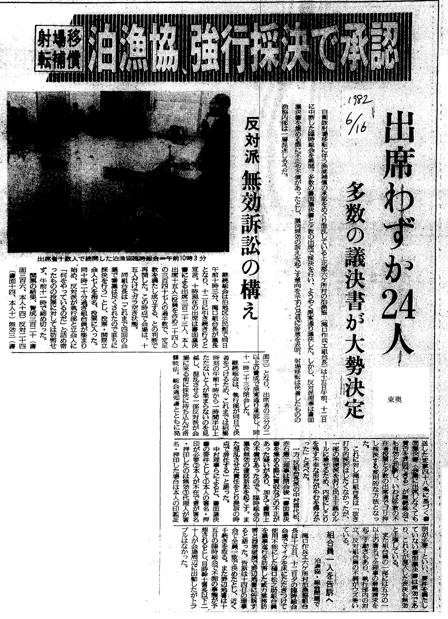 | [1982_06_16_01]射場移転補償 泊漁協、強行採決で承認 出席わずか24人 多数の議決書が大勢決定 反対派 無効訴訟の構え 組合員一人を告訴へ 泊漁協・総合問題で(東奥日報1982年6月16日) |