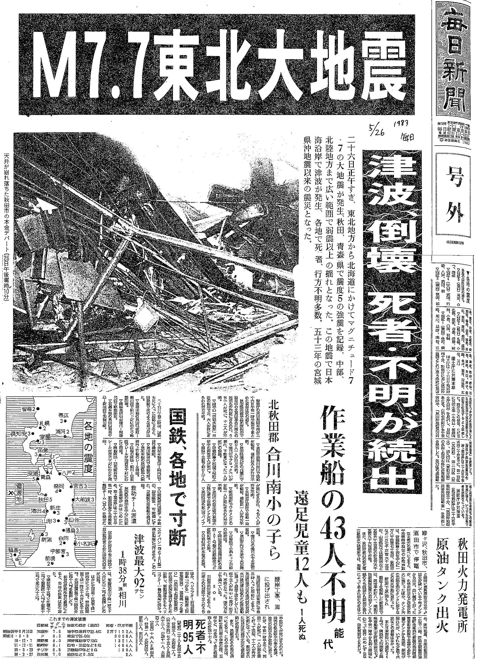 [1983_05_26_01]号外 M7.7東北大地震 津波、倒壊 死者・不明が続出 秋田火力発電所 原油タンク出火 作業船の43人不明 能代 遠足児童12人も1人死ぬ 北秋田郡相川南小の子ら 国鉄、各地で寸断 津波最大92センチ 1時38分 新潟相川 護岸工事、海に投げ出され 死者・不明95人(毎日新聞1983年5月26日)