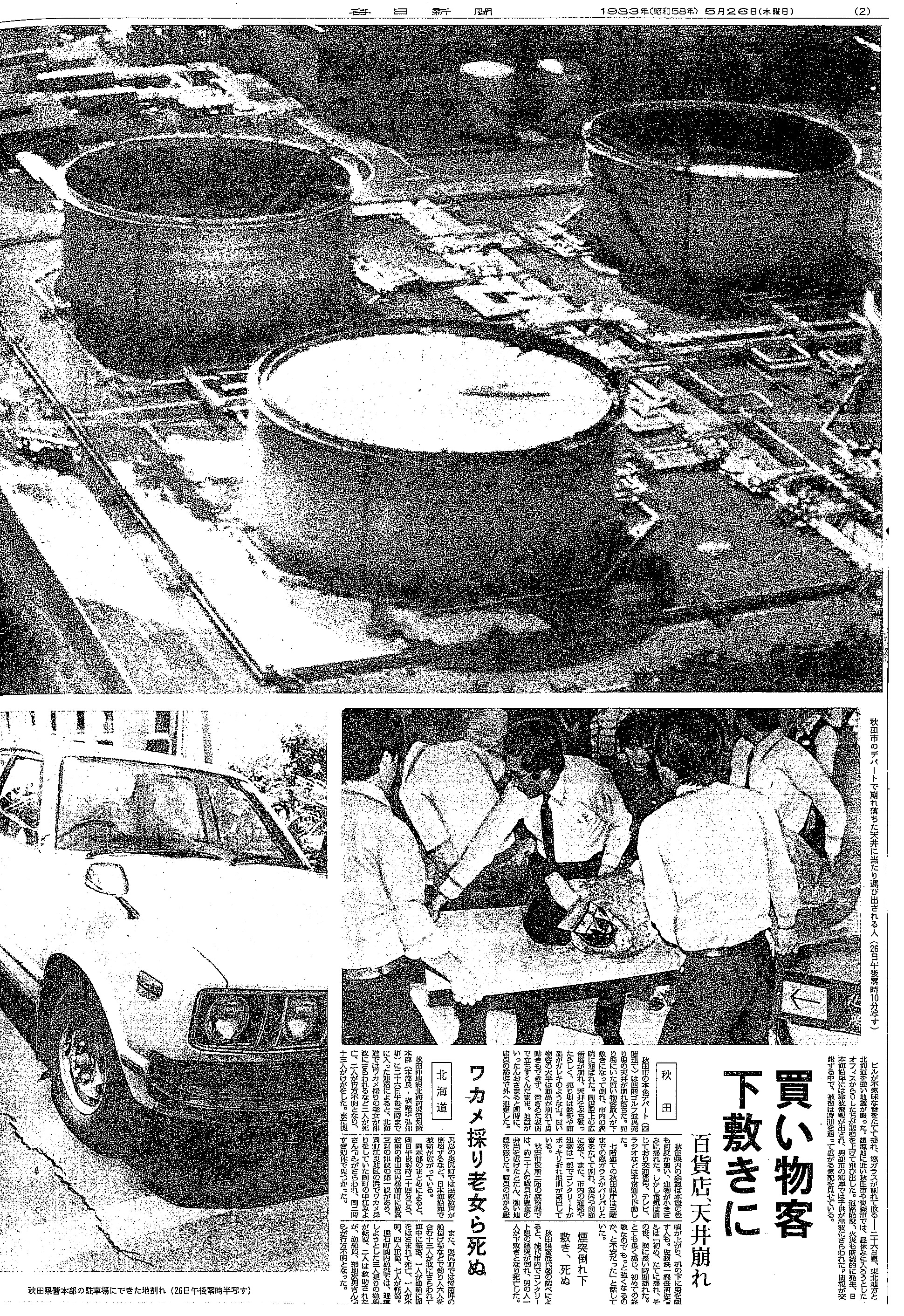 [1983_05_26_02]秋田 買い物客下敷きに 百貨店、天井崩れ 煙突倒れ下敷き、死ぬ 北海道 ワカメ採り老女ら死ぬ(毎日新聞1983年5月26日)