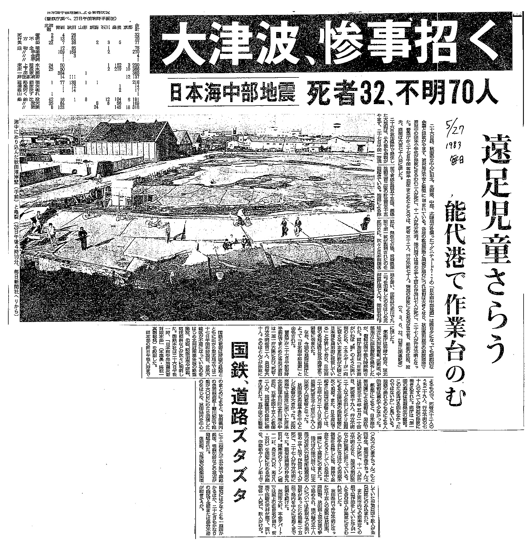 [1983_05_27_01]大津波、惨事招く 日本海中部地震 死者32、不明70人 遠足児童さらう 能代港で作業台のむ 国鉄、道路ズタズタ(毎日新聞1983年5月27日)