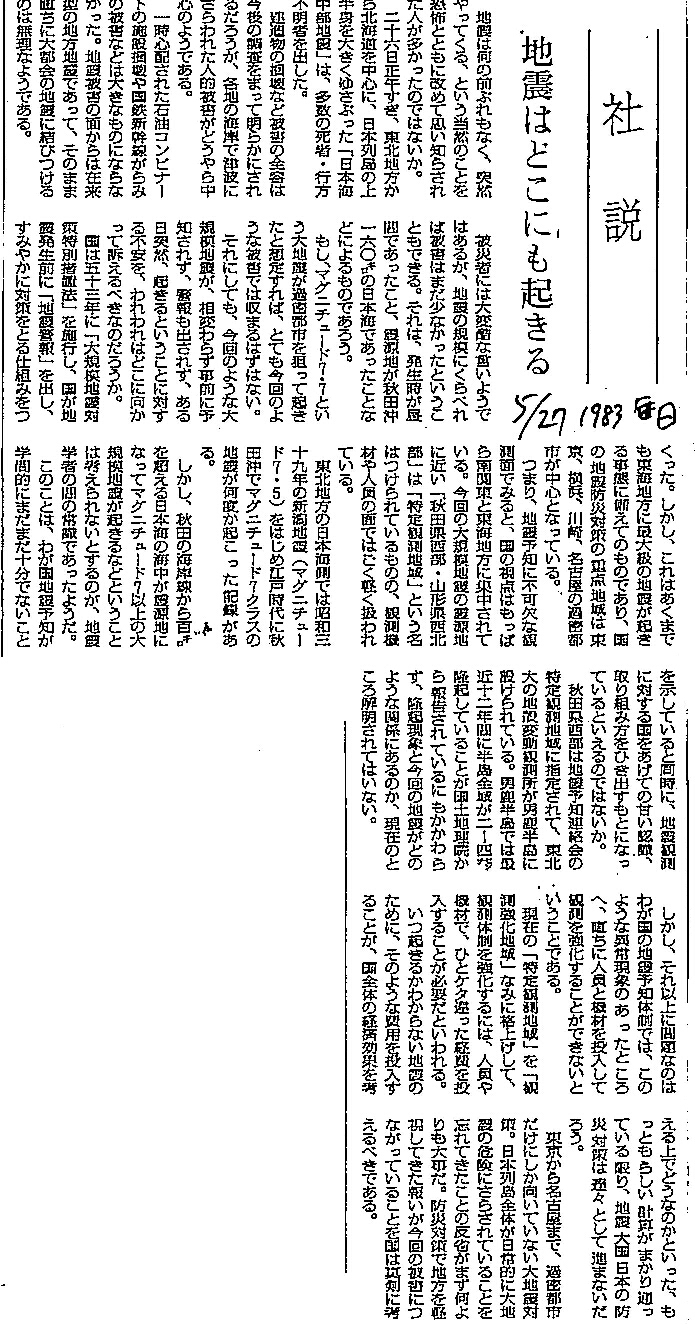 [1983_05_27_02]社説 地震はどこにも起きる(毎日新聞1983年5月27日)