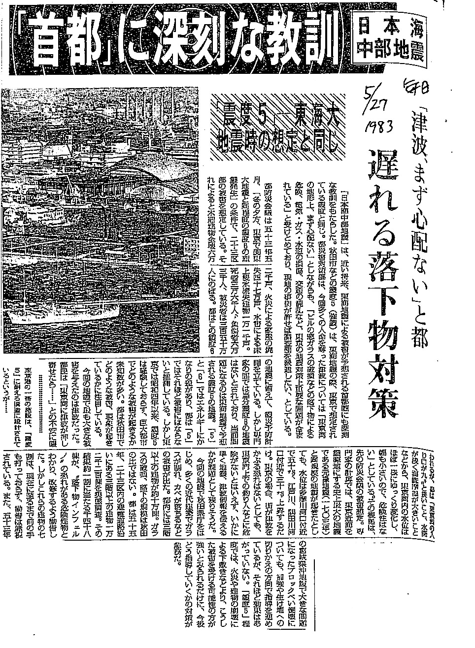[1983_05_27_05]「首都」に深刻な教訓 日本海中部地震 「津波、まず心配ない」と都 遅れる落下物対策 「震度5」 東海大地震の想定と同じ(毎日新聞1983年5月27日)