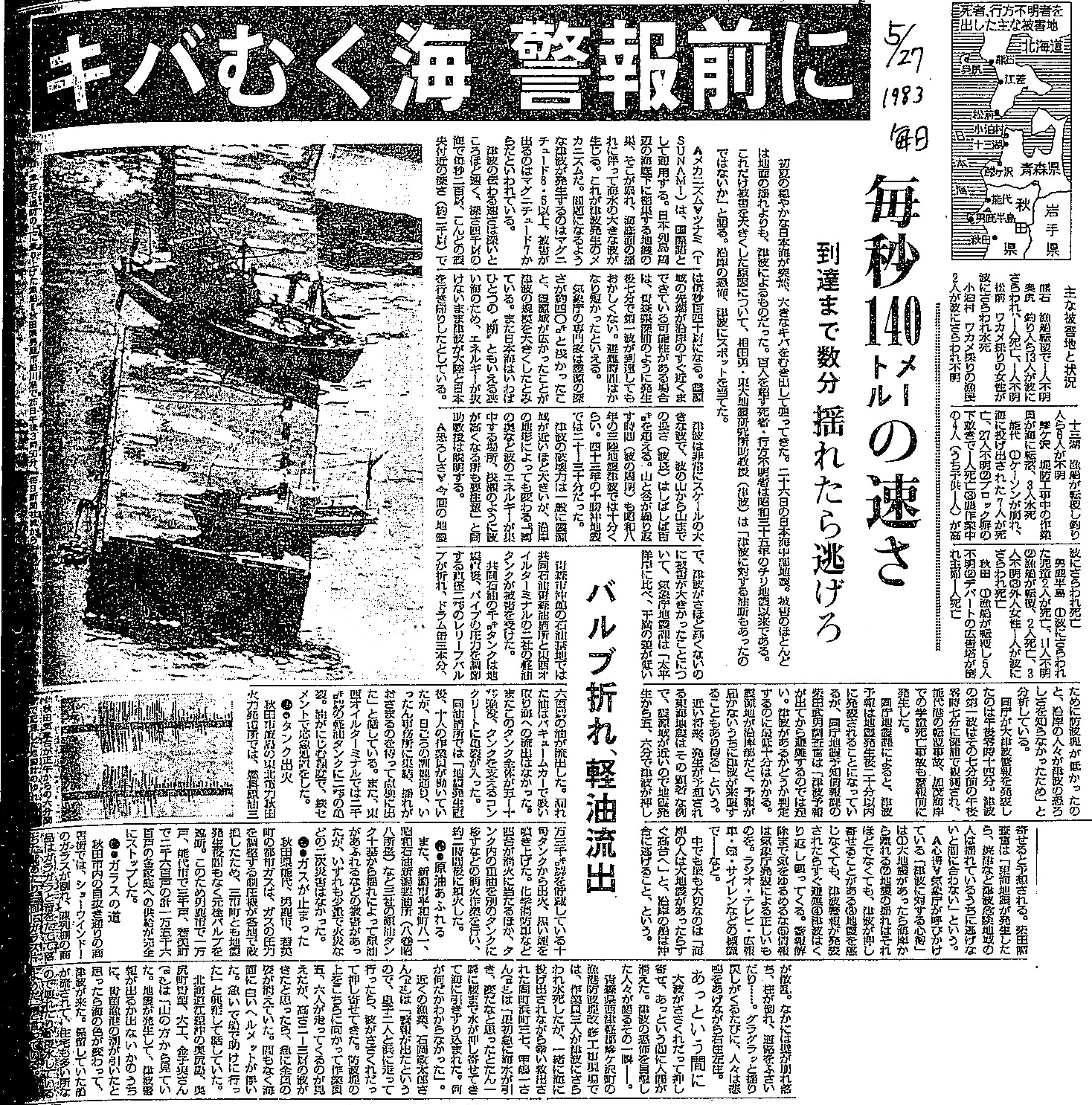 [1983_05_27_06]キバむく海 警報前に 毎秒140メートルの速さ 到達まで数分 揺れたら逃げろ バルブ折れ、軽油流出(毎日新聞1983年5月27日)