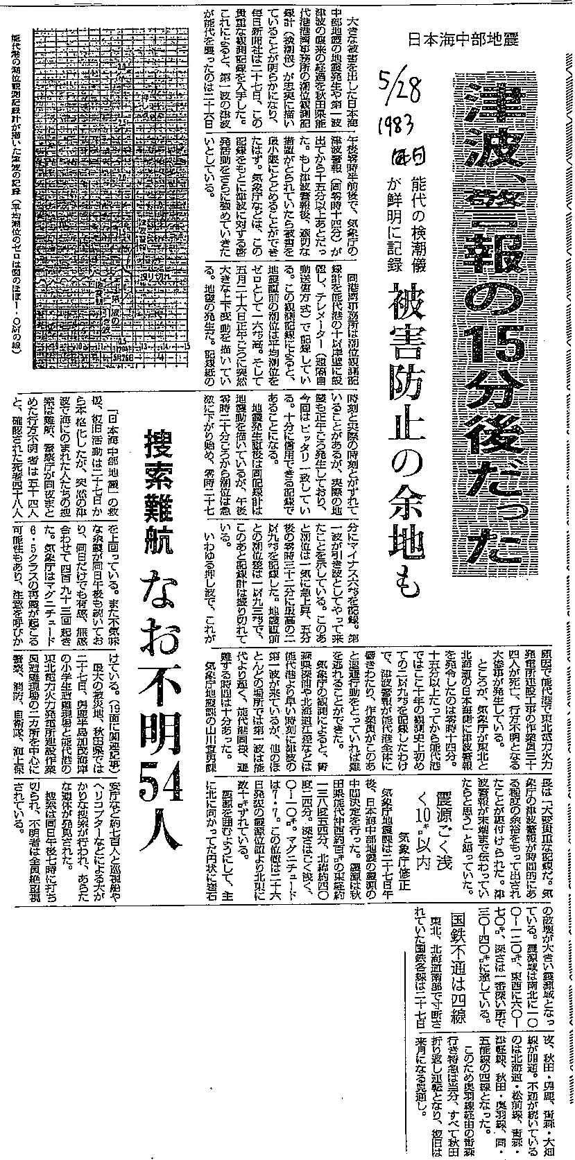 [1983_05_28_01]日本海中部地震 津波、警報の15分後だった 能代の検潮儀が鮮明に記録 被害防止の余地も 捜索難航 なお不明54人 震源ごく浅く10キロ以内 気象庁修正(毎日新聞1983年5月28日)