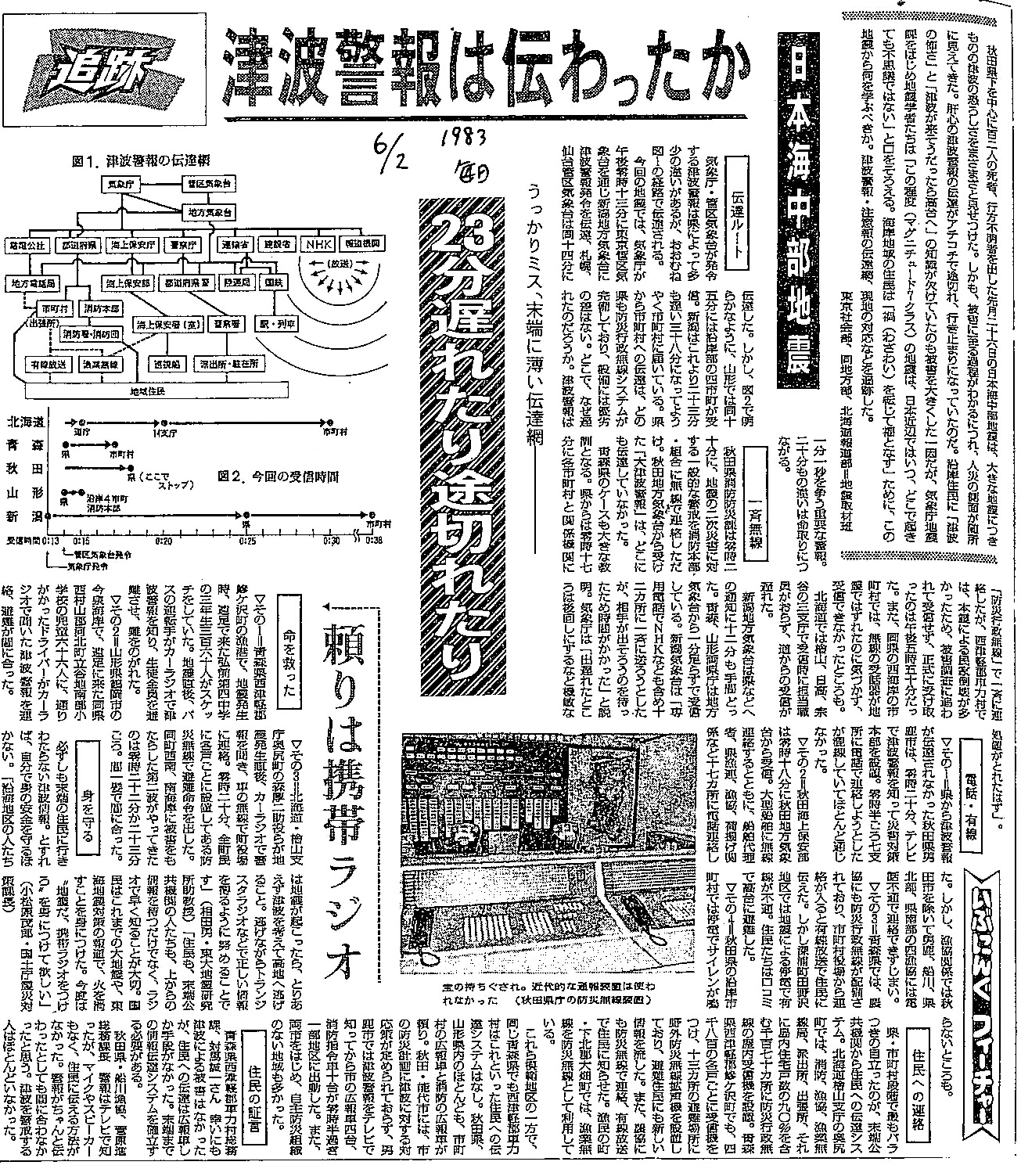 [1983_06_02_02]日本海中部地震 津波警報は伝わったか 23分遅れたり途切れたり 伝達ルート 一斉無線 電話・有線 頼りは携帯ラジオ 命を救った 身を守る 住民への連絡 住民の証言(毎日新聞1983年6月2日)