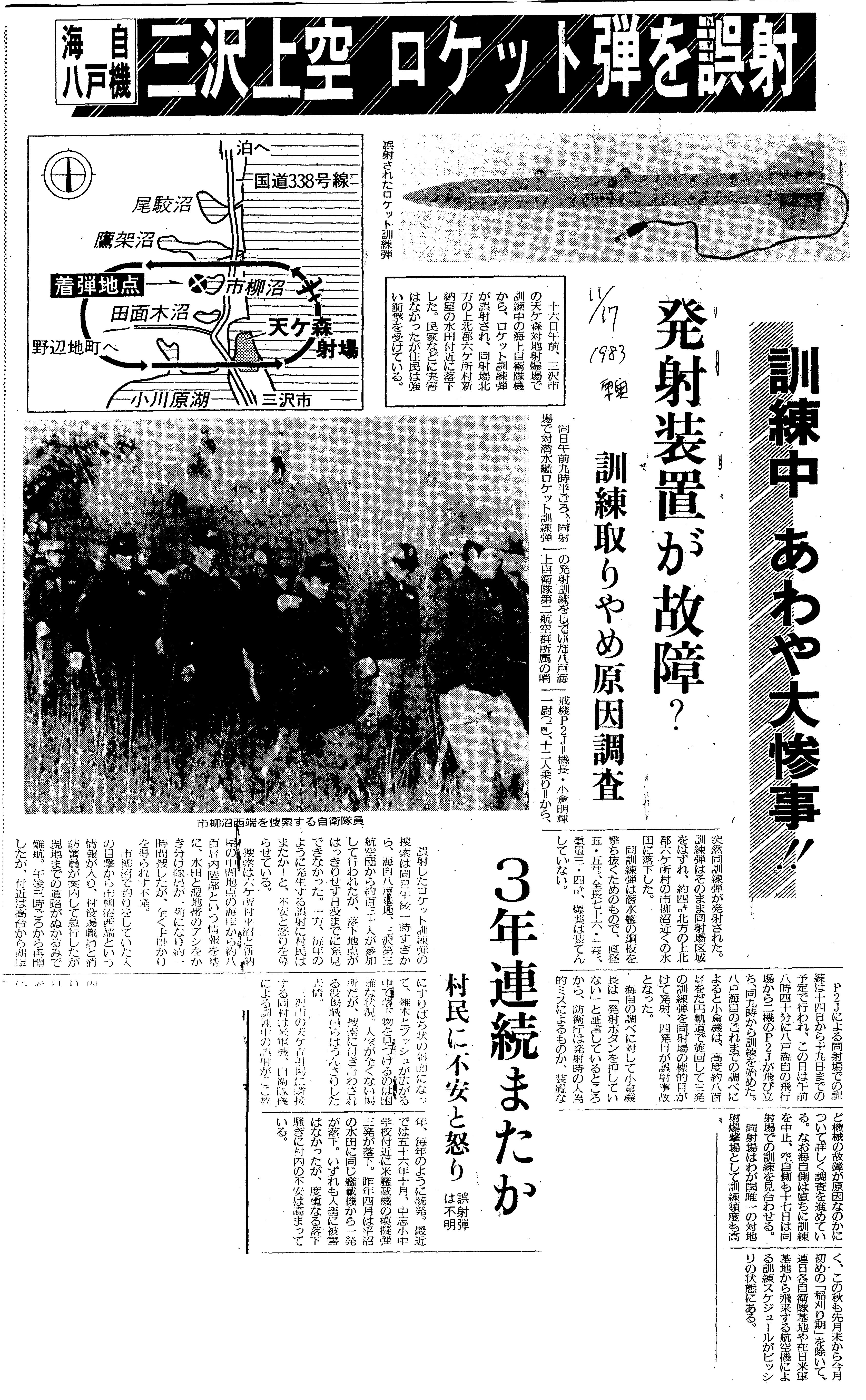 | [1983_11_17_01]海自八戸機 三沢上空 ロケット弾を誤射 訓練中 あわや大惨事!! 発射装置が故障? 訓練取りやめ原因調査 3年連続またか 村民に不安と怒り 誤射弾は不明(東奥日報1983年11月17日) |