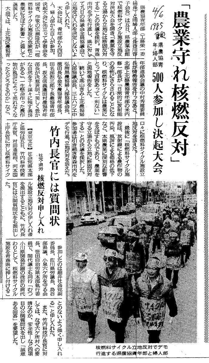| [1985_04_06_01]「農業守れ核燃反対」 県農協青年・婦人部 500人参加し決起大会 竹内長官には質問状 社党・県労 核燃反対申し入れ(東奥日報1985年4月6日) |
