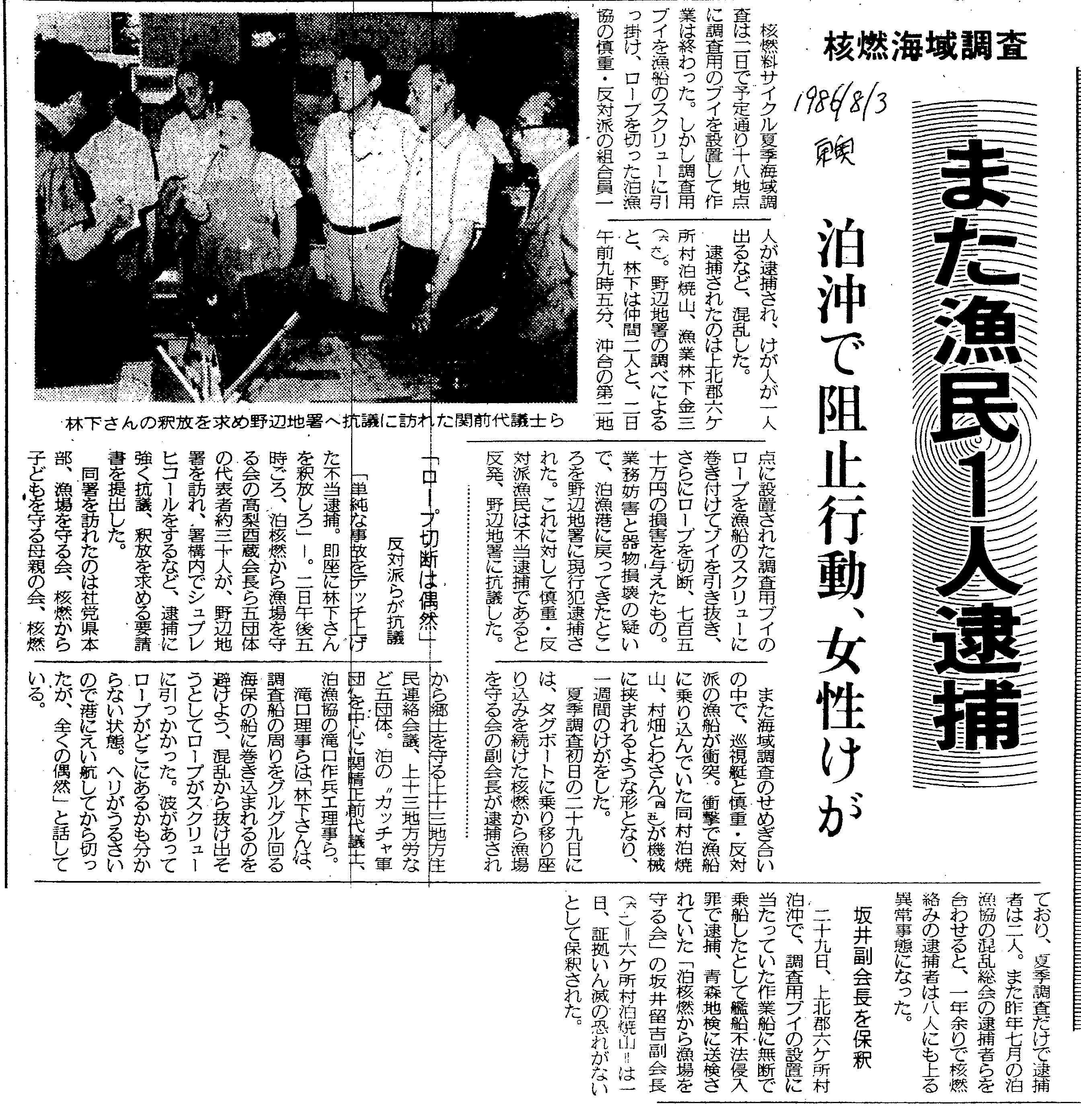 | [1986_08_03_01]核燃海域調査 また漁民1人逮捕 泊沖で阻止行動、女性けが 「ロープ切断は偶然」反対派らが抗議 坂井副会長を保釈(東奥日報1986年8月3日) |
