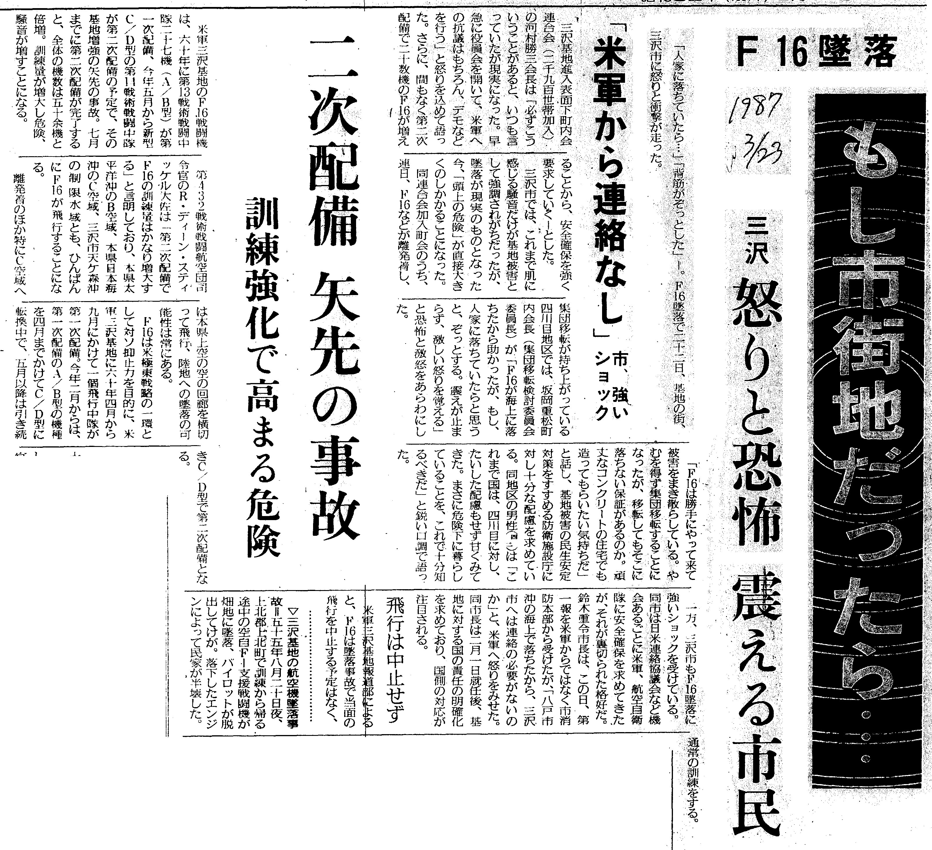 | [1987_03_23_01]F16墜落 もし市街地だったら・・・ 三沢 怒りと恐怖 震える市民 「米軍から連絡なし」 市、強いショック 二次配備 矢先の事故 訓練強化で高まる危険 飛行は中止せず(東奥日報1987年3月23日) |