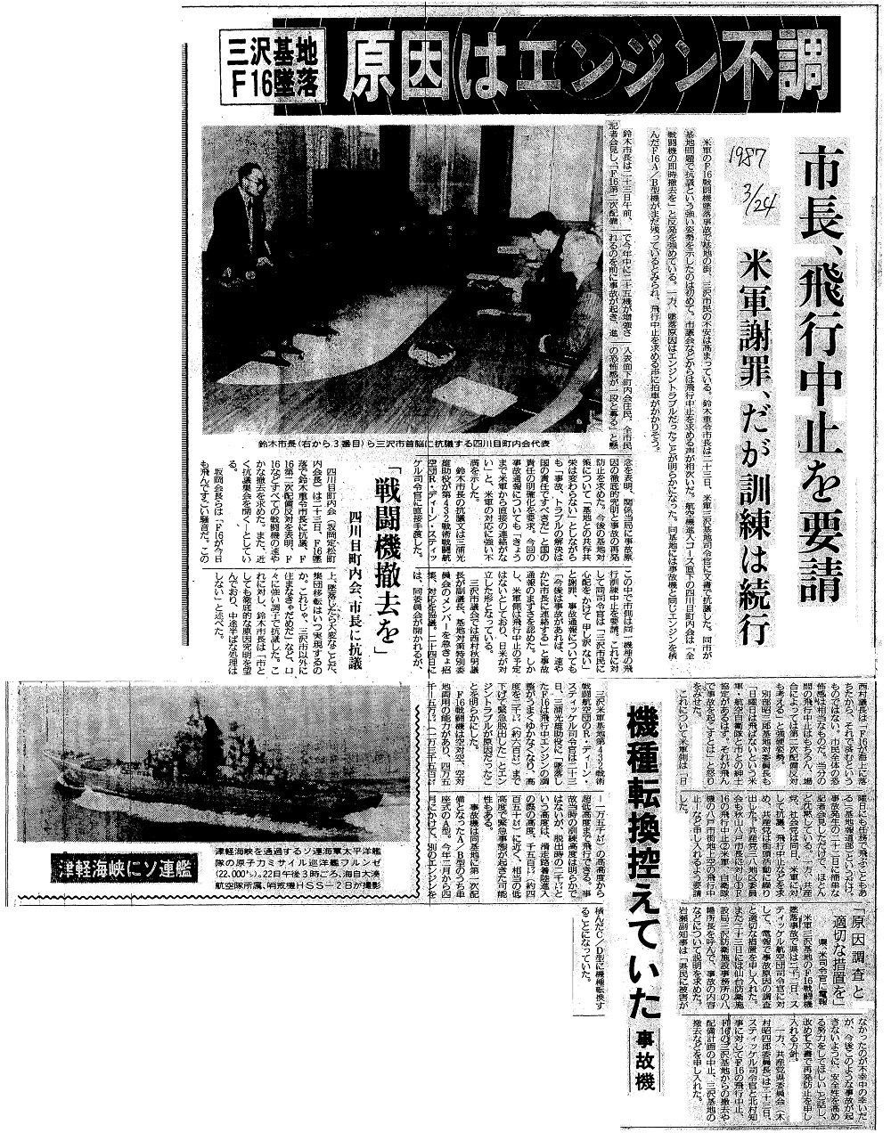 | [1987_03_24_01]三沢基地F16墜落 原因はエンジン不調 市長、飛行中止を要請 米軍謝罪、だが訓練は続行 「戦闘機撤去を」 四川目町内会、市長に抗議 機種転換控えていた 事故機 「原因調査と適切な措置を」 県、米司令官に電報 津軽海峡にソ連艦(東奥日報1987年3月24日) |