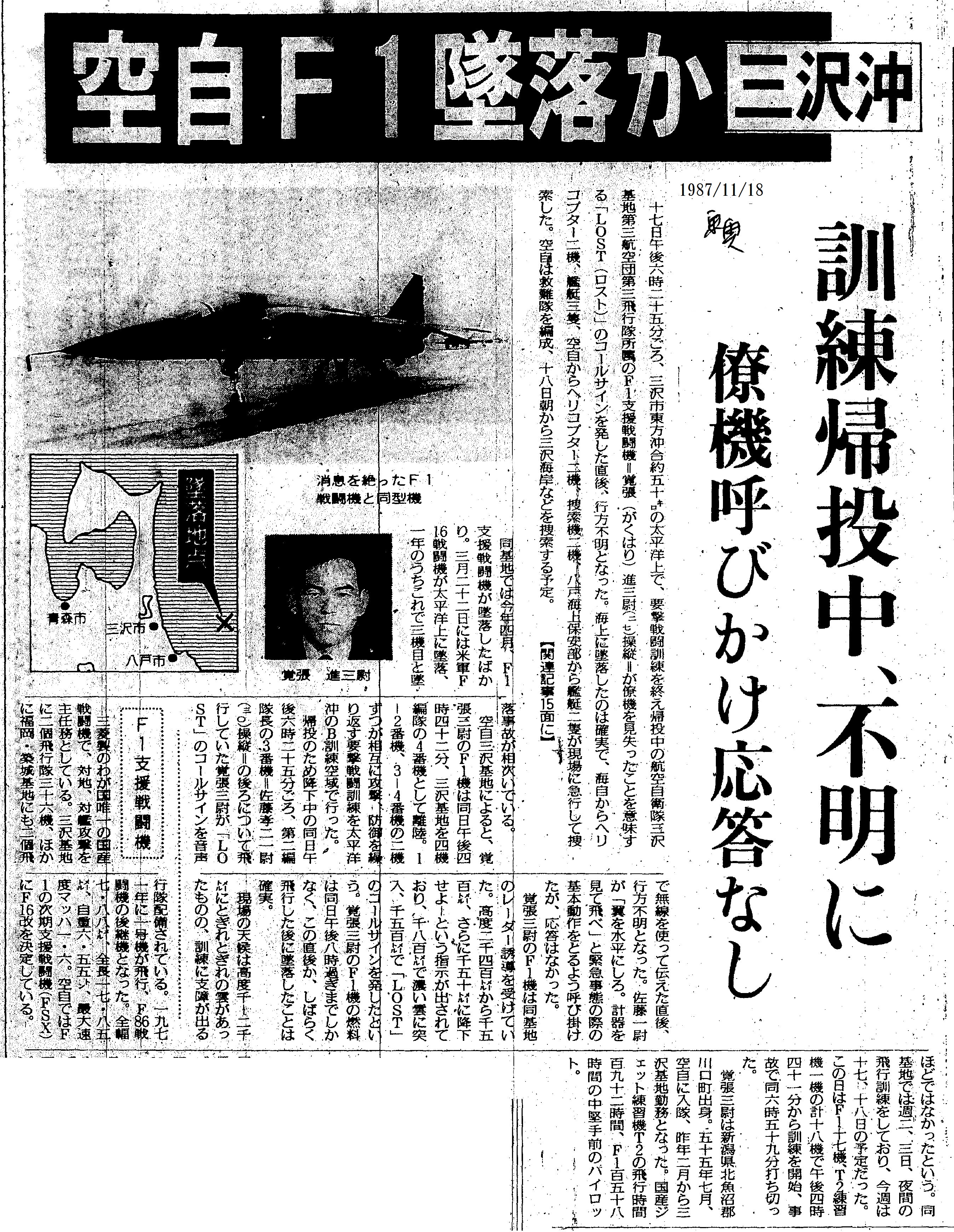 | [1987_11_18_03]空自F1墜落か 三沢沖 訓練帰投中、不明に 僚機呼びかけ応答なし(東奥日報1987年11月18日) |