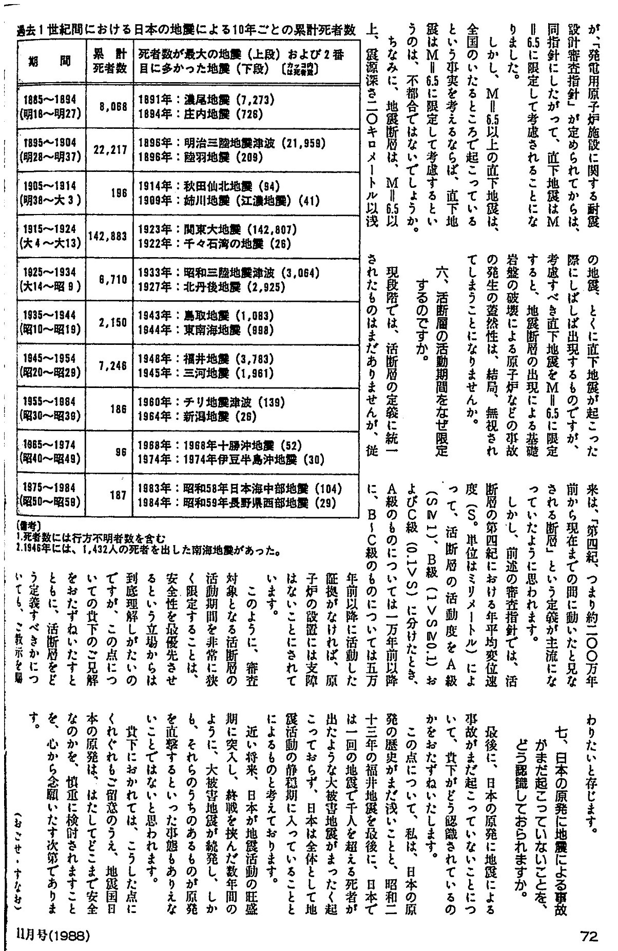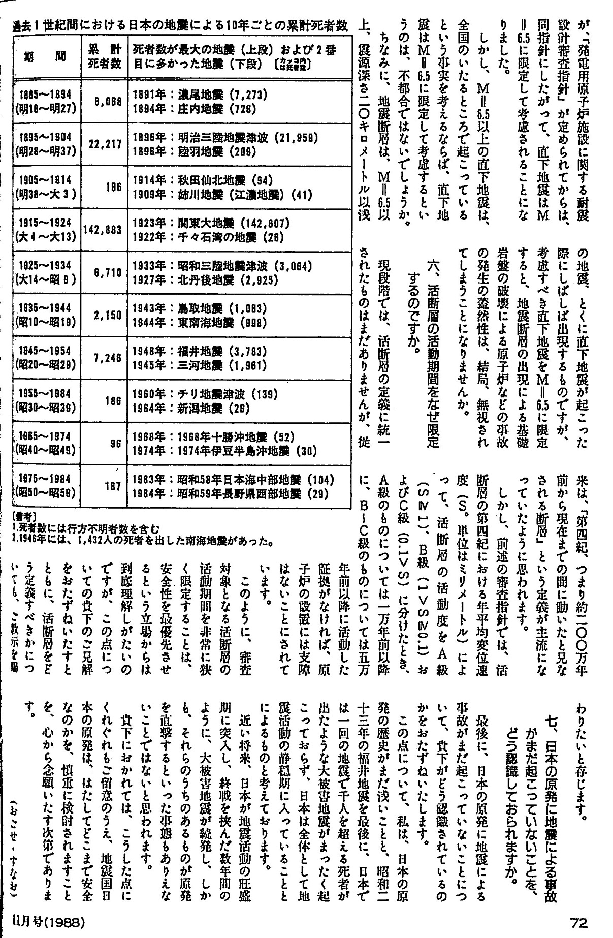 が、「発電用原子炉施設に関する耐震設計審査指針」が定められてからは、同指針にしたがって、直下地震はM=6.5に限定して考慮されることになりました。 しかし、M=6.5以上の直下地震は、全国のいたるところで起こっているという事実を考えるならば、直下地震はM=6.5に限定して考慮するというのは、不都合ではないでしょうか。 ちなみに、地震断層は、M=6.5以上、震源探さ二〇キロメートル以浅の地震、とくに直下地震が起こった際にしばしば出現するものですが、考慮すべき直下地震をM=6.5に限定すると、地震断層の出現による基礎岩盤の破壊による原子炉などの事故の発生の蓋然性は、結局、無視されてしまうことになりませんか。 六、活断層の活動期間をなぜ限定するのですか。 現段階では、活断層の定義に統一されたものはまだありませんが、従来は、「第四紀、つまり約二〇〇万年前から現在までの間に動いたと見なされる断層」という定義が主流になっていたように思われます。 しかし、前述の審査指針では、活断層の第四紀における年平均変位速度(S。単位はミリメートル)によって、活断層の活動度をA級(S≧1)、B級(1>S≧0.1)およびC級(0.1>S)に分けたとき、A級のものについては一万年前以降に、B−C級のものについては五万年前以降に活動した証拠がなければ、原子炉の設置には支障はないことにされています。 このように、審査対象となる活断層の活動期間を非常に狭く限定することは、安全性を最優先させるという立場からは到底理解しがたいのですが、この点についての貴下のご見解をおたずねいたすとともに、活断層をどう定義すべきかについても、ご教示を賜わりたいと存じます。 七、日本の原発に地震による事故がまだ起こっていないことを、どう認識しておられますか。 最後に、日本の原発に地震による事故がまだ起こっていないことについて、貴下がどう認識されているのかをおたずねいたします。 この点について、私は、日本の原発の歴史がまだ浅いことと、昭和二十三年の福井地震を最後に、日本では一回の地震で千人を超える死者が出たような大被害地震がまったく起こっておらず、日本は全体として地震活動の静穏期に入っていることとによるものと考えております。 近い将来、日本が地震活動の旺盛期に突入し、終戦を挟んだ数年間のように、大被害地震が続発し、しかも、それらのうちのあるものが原発を直撃するといった事態もありえないことではないと思われます。 貴下におかれては、こうした点にくれぐれもご留意のうえ、地震国日本の原発は、はたしてどこまで安全なのかを、慎重に検討されますことを、心から念願いたす次第であります。 |