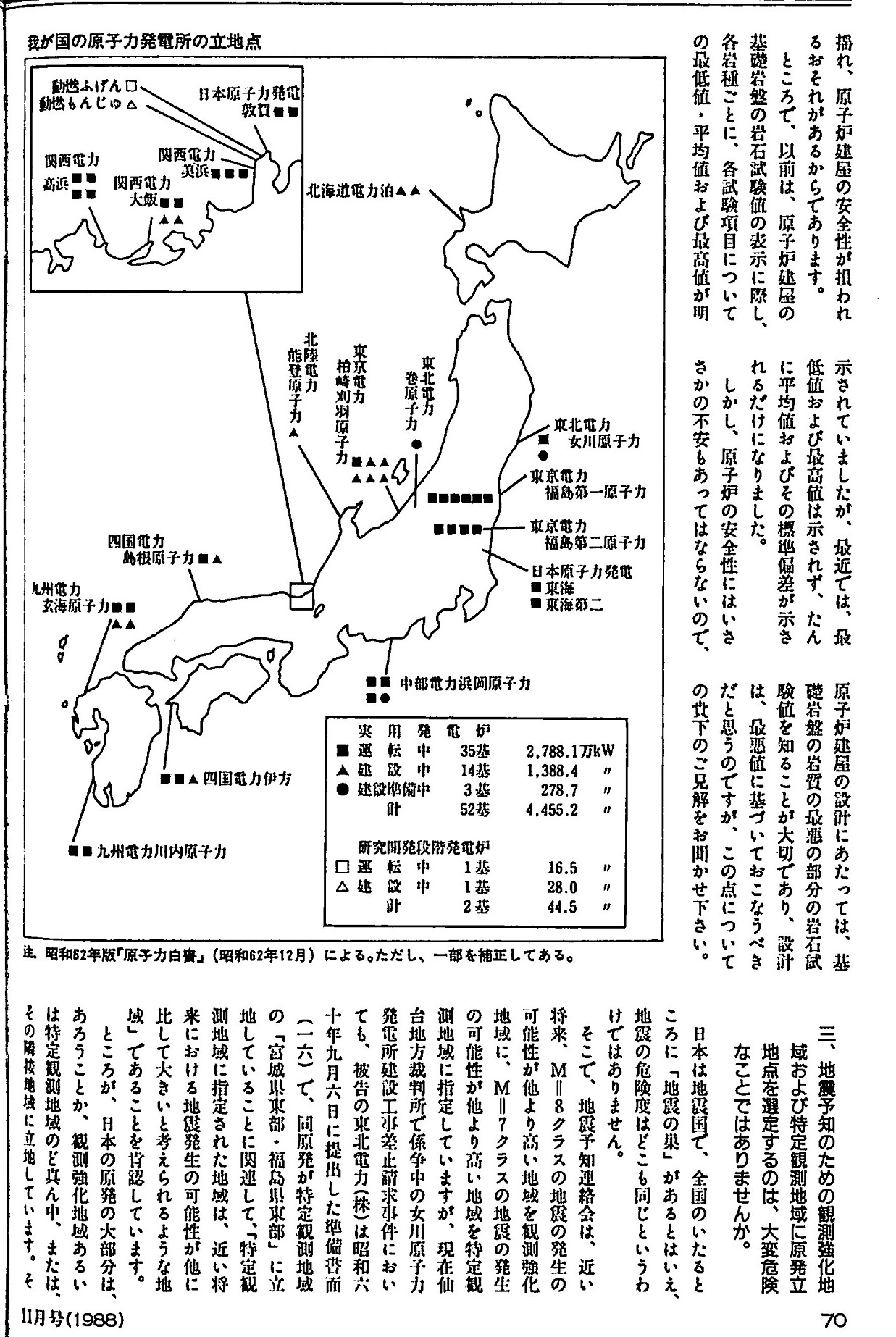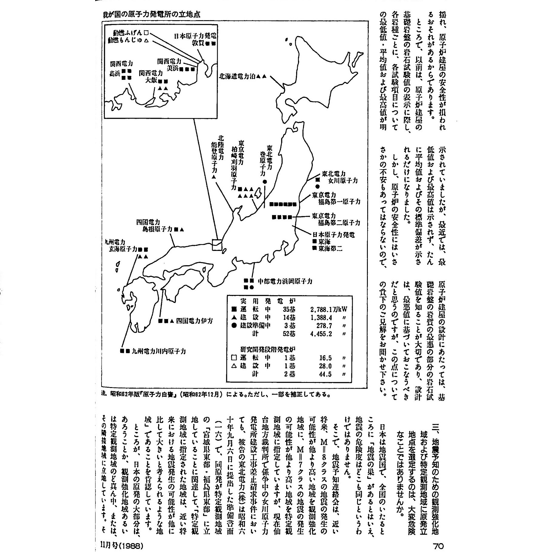 揺れ、原子炉建屋の安全性が損われるおそれがあるからであります。 ところで、以前は、原子炉建屋の基礎岩盤の岩石試験値の表示に際し、各岩種ごとに、各試験項目についての最低値・平均値および最高値が明示されていましたが、最近では、最低値およぴ最高値は示されず、たんに平均値およびその標準偏差が示されるだけになりました。 しかし、原子炉の安全性にはいささかの不安もあってはならないので、原子炉建屋の設計にあたっては、基礎岩盤の岩質の最悪の部分の岩石拭験を知ることが大切であり、設計は、最悪値に基づいておこなうべきだと思うのですが、この点についての貴下のご見解をお聞かせ下さい。 三、地震予知のための観測強化地域および特定観測地域に原発立地点を選定するのは、大変危険なことではありませんか。 日本は地震国で、全国のいたるところに「地震の巣」があるとはいえ、地震の危険度はどこも同じというわけではありません。 そこで、地震予知連絡会は、近い将来、M=8クラスの地震の発生の可能性が他より高い地域を観測強化地域に、M=7クラスの地震の発生の可能性が他より高い地域を特定観測地城に指定していますが、現在仙台地方裁判所で係争中の女川原子力発電所建設工事差止請求事件においても、被告の東北電力(株)は昭和六十年九月六日に提出した準備書而(一六)で、同原発が特定観測地域の「宮城県東部・福島県東部」に立地していることに問連して、「特定観測地域に指定された地域は、近い将来における地震発生の可能性が他に比して大きいと考えられるような地域」であることを肯認しています。 ところが、日本の原発の大部分は、あろうことか、観測強化地域あるいは特定観測地域のど真ん中、または、その隣接地域に立地しています。そ |
