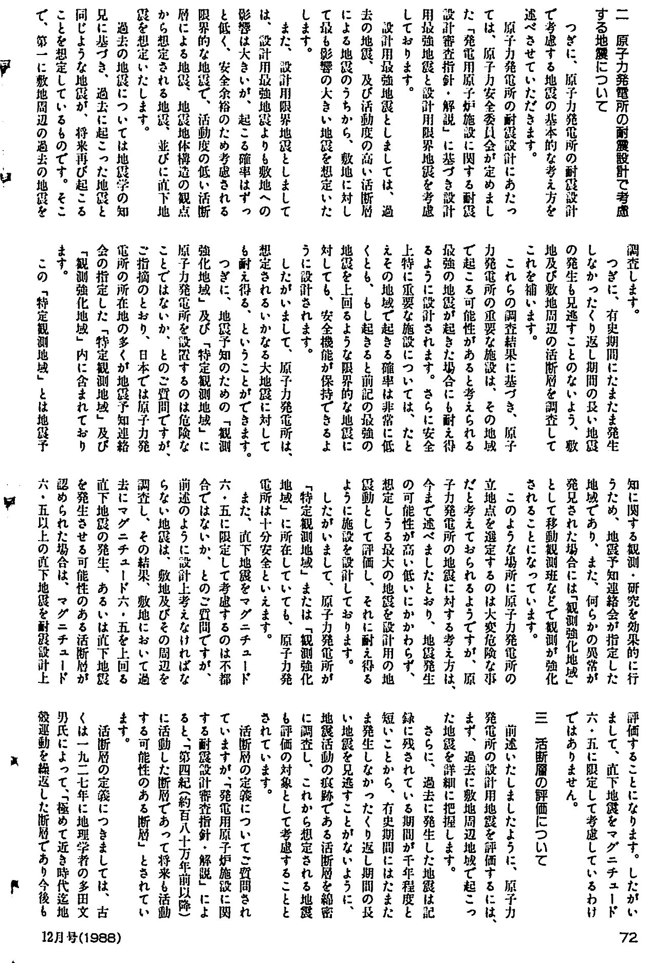 二 原子力発電所の耐震設計で考慮する地震について つぎに、原子力発電所の耐震設計で考慮する地震の基本的な考え方を述べさせていただきます。 原子力発電所の耐震設計にあたっては、原子力安全委員会が定めました「発電用原子炉施設に関する耐震設計審査指針・解説」に基づき設計用最強地震と設計用限界地震を考慮しております。 設計用最強地震としましては、過去の地震、及び活動度の高い活断層による地震のうちから、敷地に対して最も影響の大きい地震を想定いたします。 また、設計用限界地震としましては、設計用最強地震よりも敷地への影響は大きいが、起こる確率はずっと低く、安全余裕のため考慮される限定的な地震で、活動度の低い活断層による地震、地震地体構造の観点から想定される地震、並びに直下地震を想定いたします。 過去の地震については地震学の知見に基づき、過去に起こった地震と同じような地震が、将来再び起こることを想定しているものです。そこで、第一に敷地周辺の過去の地震を調査します。 つぎに、有史期間にたまたま発生しなかったくり返し期間の長い地震の発生も見逃すことのないよう、敷地及び敷地周辺の活断層を調査してこれを補います。 これらの調査結果に基づき、原子力発電所の重要な施設は、その地域で起こる可能性があると考えられる最強の地震が起きた場合にも耐え得るように設計されます。さらに安全上特に重要な施設については、たとえその地城で起きる確率は非常に低くとも、もし起きると前記の最強の地震を上回るような限界的な地震に対しても、安全機能が保持できるように設計されます。 したがいまして、原子力発電所は、想定されるいかなる大地震に対しても耐え得る、ということができます。 つぎに、地震予知のための「観測強化地域」及び「特定観測地城」に原子力発電所を設置するのは危険なことではないか、とのご質問ですが、ご指摘のとおり、日本では原子力発電所の所在地の多くが地震予知連絡会の指定した「特定観測地域」及び「観測強化地域」内に含まれております。 この「特定観測地域」とは地震予知に関する観測・研究を効果的に行うため、地震予知連絡会が指定した地域であり、また、何らかの異常が発見された場合には「観測強化地域」として移動観測班などで観測が強化されることになっています。 このような場所に原子力発電所の立地点を選定するのは大変危険な事だと考えておられるようですが、原子力発電所の地盤に対する考え方は、今まで述べましたとおり、地震発生の可能性が高い低いにかかわらず、想定しうる最大の地震を設計用の地震動として評価し、それに耐え得るように施設を設計しております。 したがいまして、原子力発電所が「特定観測地城」または「観測強化地域」に所在していても、原子力発電所は十分安全といえます。 また、直下地震をマグニチュード六・五に限定して考慮するのは不都合ではないか、とのご質問ですが、前述のように設計上考えなければならない地震は、敷地及びその周辺を調査し、その結果、敷地において過去にマグニチュード六・五を上回る直下地震の発生、あるいは直下地震を発生させる可能性のある活断層が認められた場合は、マグニチュード六・五以上の直下地震を耐震設計上評価することになります。したがいまして、直下地震をマグニチュード六・五に限定して考慮しているわけではありません。 三 活断層の評価について 前述いたしましたように、原子力発電所の設計用地震を評価するには、まず、過去に敷地周辺地城で起こった地震を詳細に把握します。 さらに、過去に発生した地震は記録に残されている期間が千年程度と短いことから、有史期間にはたまたま発生しなかったくり返し期問の長い地震を見逃すことがないように、地震活動の痕跡である活断層を綿密に調査し、これから想定される地震も評価の対象として考慮することとされています。 活断層の定義についてご質問されていますが、「発電用原子炉施設に関する耐震設計審査指針・解説」によると、「第四紀(約百八十万年前以降)に活動した断層であって将来も活動する可能性のある断層」とされています。 活断層の定義につきましでは、古くは一九二七年に地理学者の多田文男氏によって、「極めて近き時代迄地殻運動を繰返した断層であり今後も |