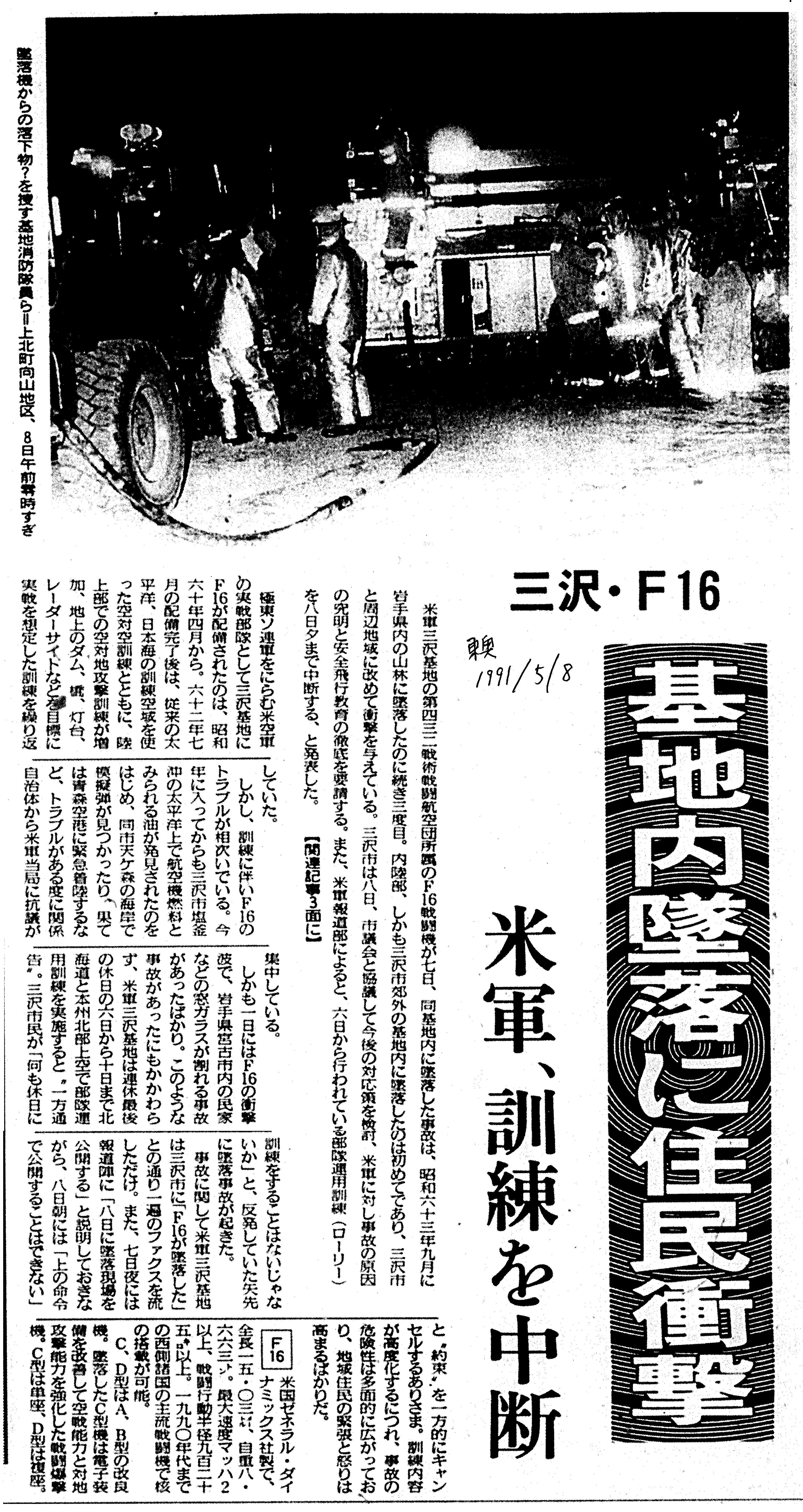| [1991_05_08_02]三沢・F16 基地内墜落に住民衝撃 米軍、訓練を中断(東奥日報1991年5月8日) |