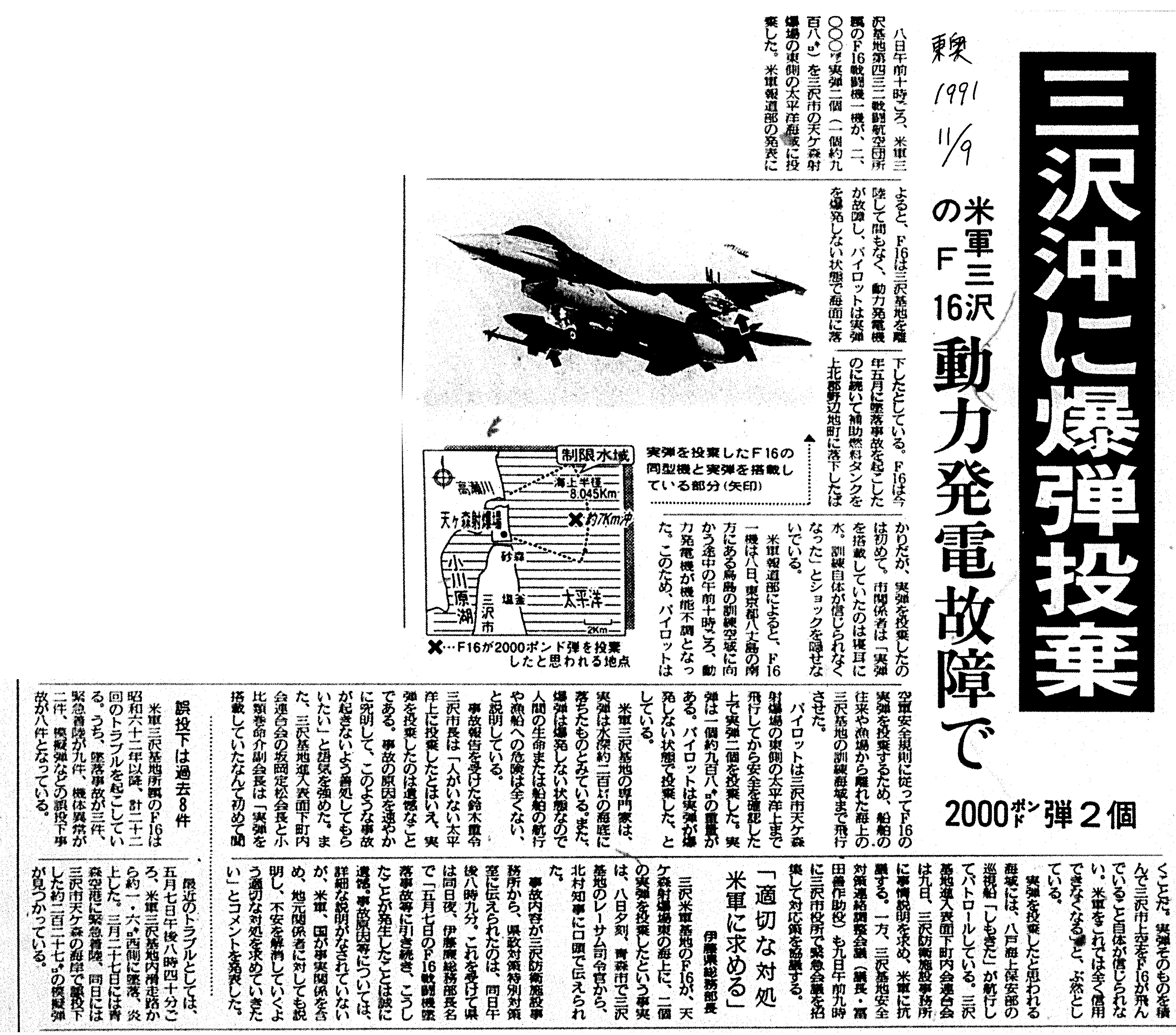 | [1991_11_09_02]三沢沖に爆弾投棄 米軍三沢のF16 動力発電故障で 2000ポンド弾2個 「適切な対処 米軍に求める」 伊藤県総務部長 誤投下は過去8件(東奥日報1991年11月9日) |