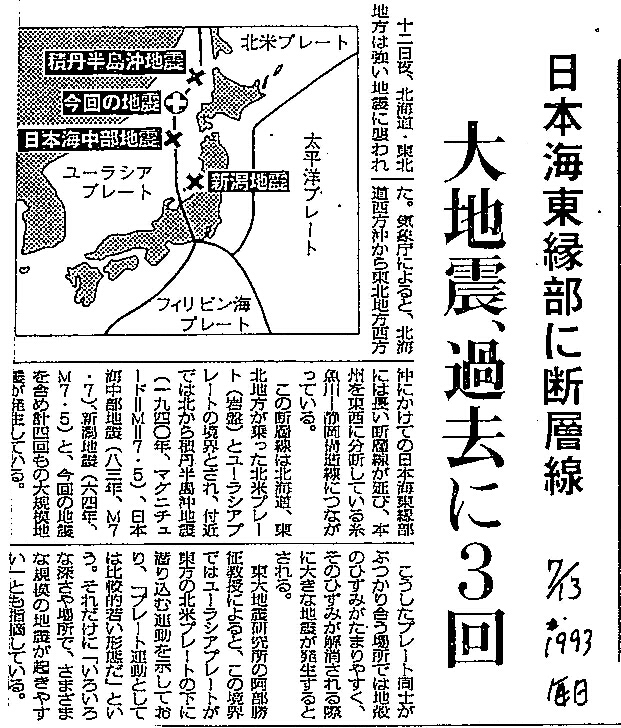 [1993_07_13_02]日本海東縁部に断層線 大地震、過去に3回(毎日新聞1993年7月13日)