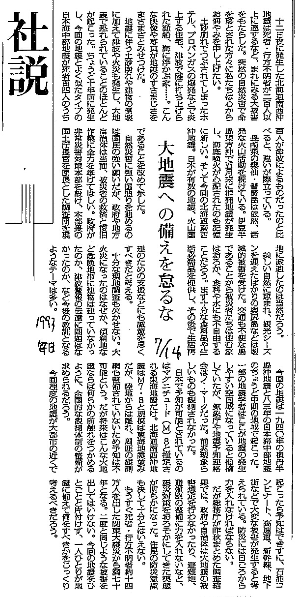 [1993_07_14_02]社説 大地震への備えを怠るな(毎日新聞1993年7月14日)
