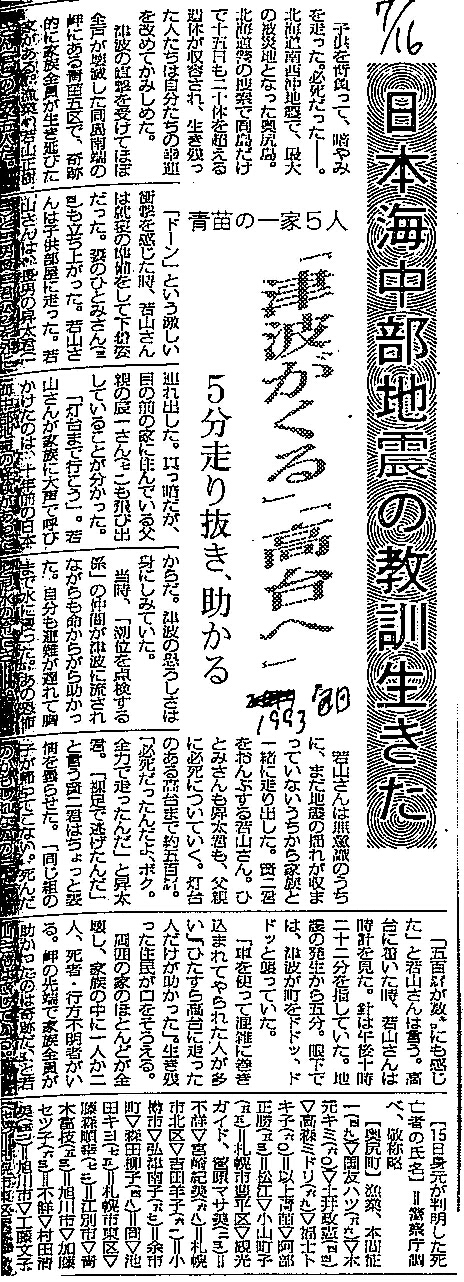 [1993_07_16_01]日本海中部地震の教訓生きた 青苗の一家5人 「津波がくる」「高台へ」5分走りぬき、助かる(毎日新聞1993年7月16日)