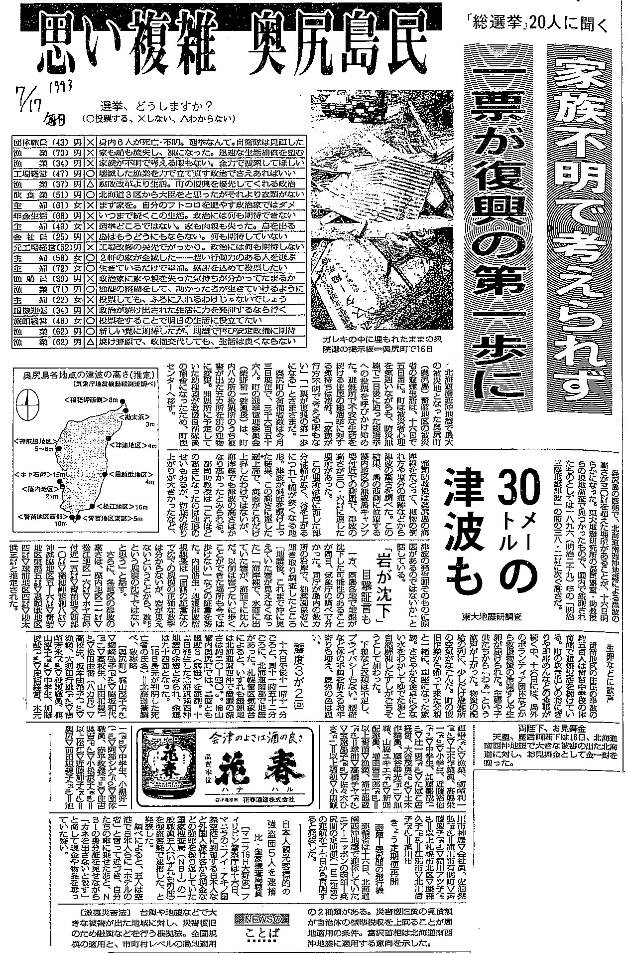 [1993_07_17_01]思い複雑 奥尻島民 「総選挙」20人に聞く 家族不明で考えられず 一票が復興の第一歩に 30メートルの津波も 東大地震研調査 「岩が沈下」目撃証言も 生卵などに歓声 震度3が2回(毎日新聞1993年7月17日)