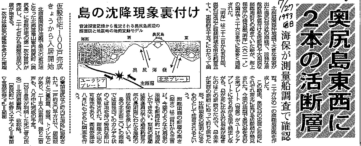 [1993_07_27_01]奥尻島東西に2本の活断層 海保が測量船調査で確認 仮設住宅100戸完成 きょうから入居開始(毎日新聞1993年7月27日)