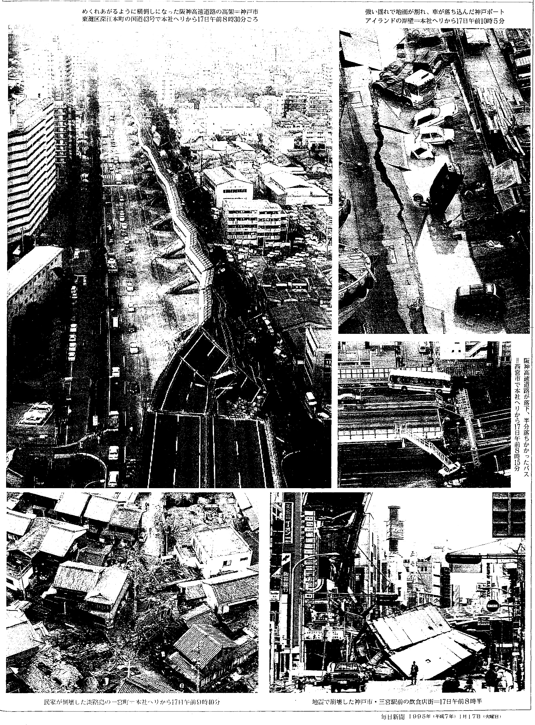 [1995_01_17_08]めくれあがるように横倒しになった阪神高速道路の高架(毎日新聞1995年1月17日)