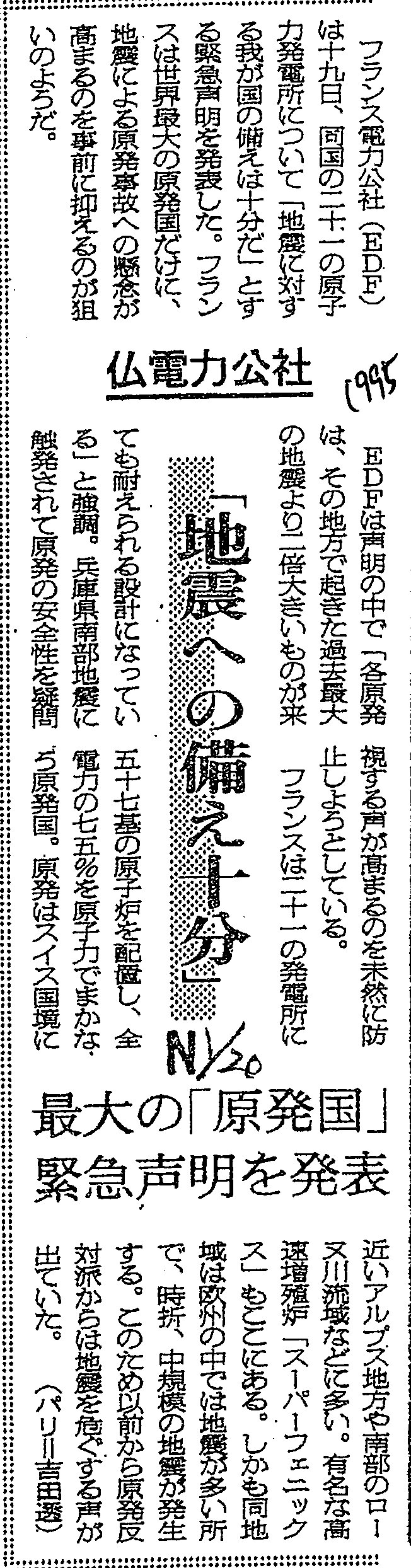 [1995_01_20_01]仏電力公社 「地震への備え十分」 最大の「原発国」 緊急声明を発表(日経新聞1995年1月20日)