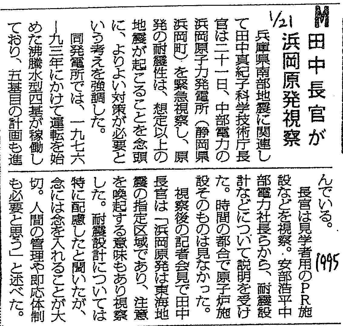[1995_01_21_01]田中長官が浜岡原発視察(毎日新聞1995年1月21日)