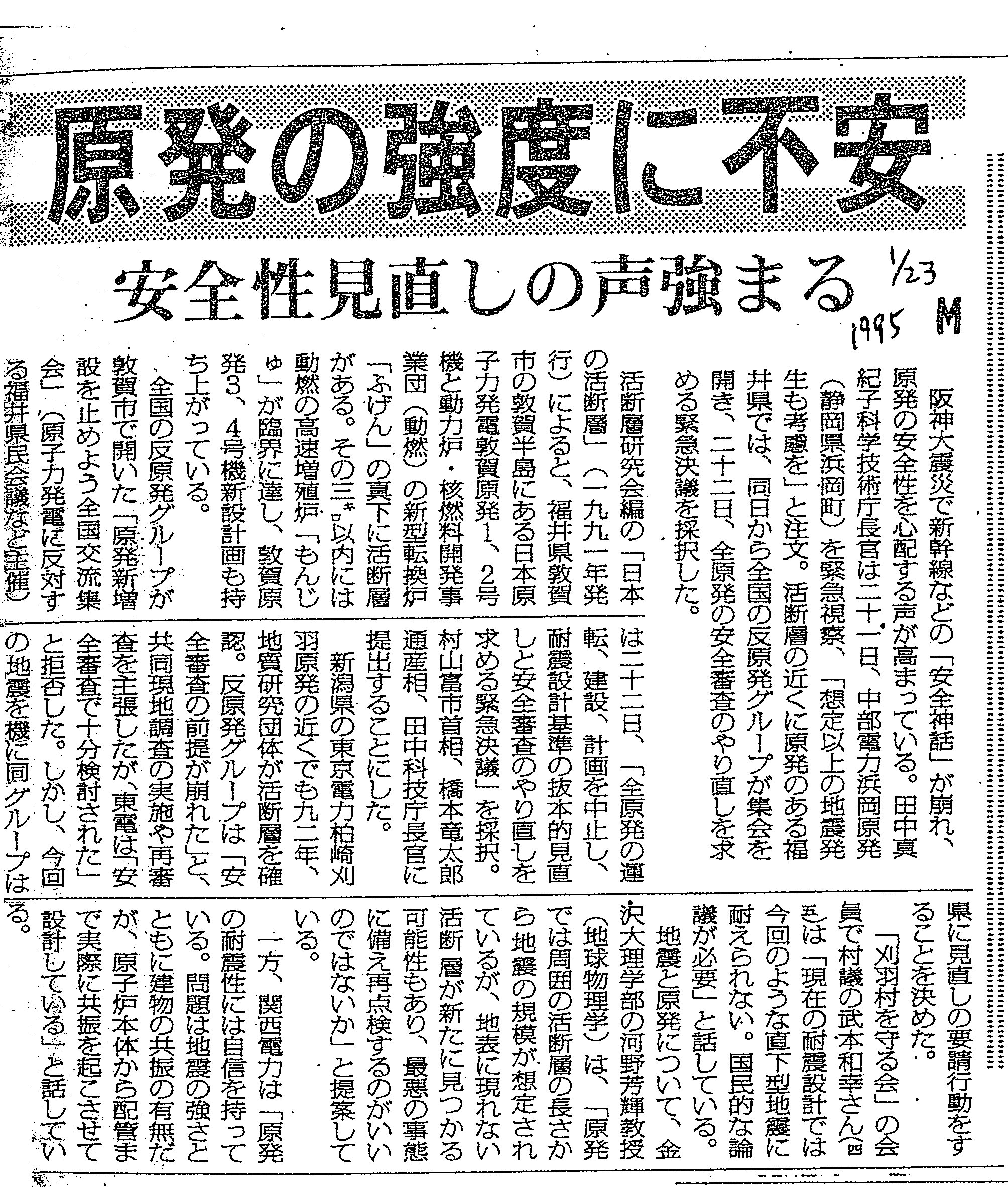 | [1995_01_23_01]原発の強度に不安 安全性見直しの声強まる(毎日新聞1995年1月23日) |