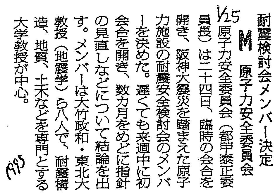 [1995_01_25_01]耐震検討会メンバー決定 原子力安全委員会(毎日新聞1995年1月25日)