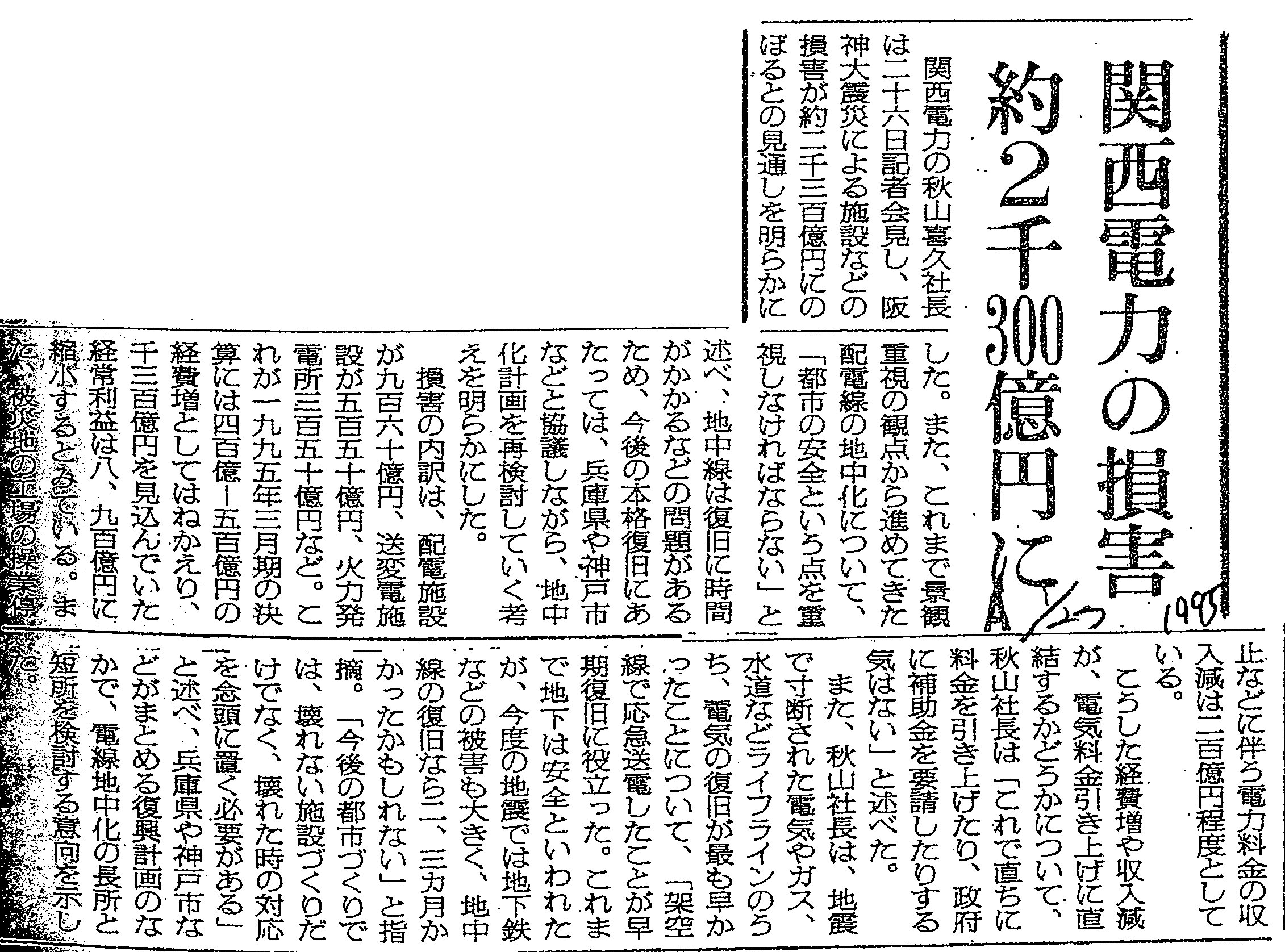 [1995_01_27_01]関西電力の損害 約2千300億円に(朝日新聞1995年1月27日)
