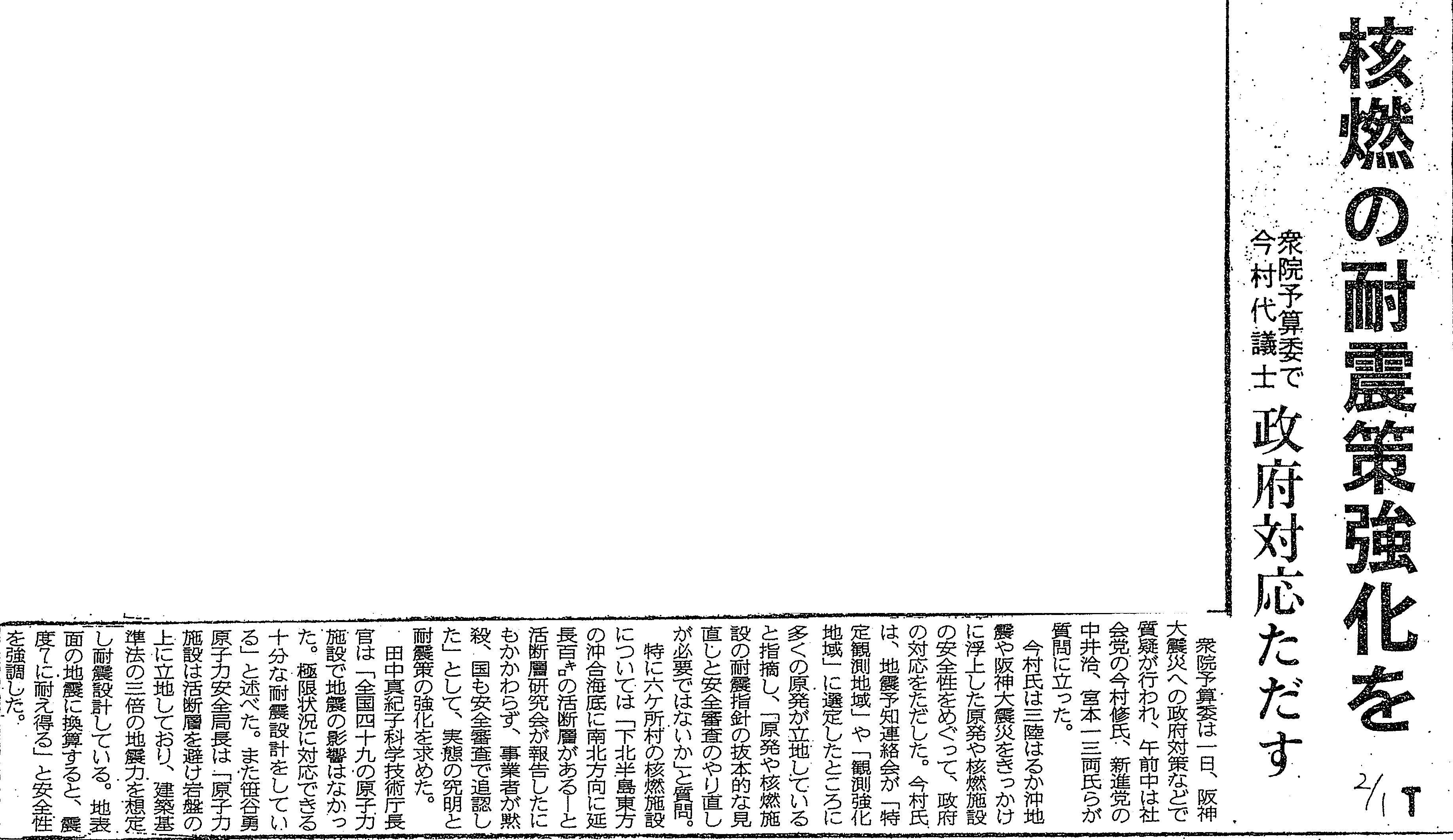 | [1995_02_01_01]核燃の耐震策強化を 衆院予算委で今村代議士 政府対応ただす(東奥日報1995年2月1日) |